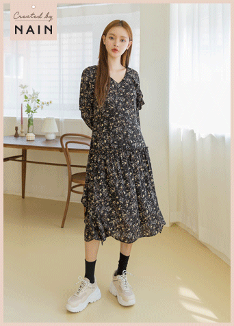 은은한 컬러감의 플로럴 프린트와 러플 포인트가 페미닌한무드를 주는 롱 원피스입니다.
