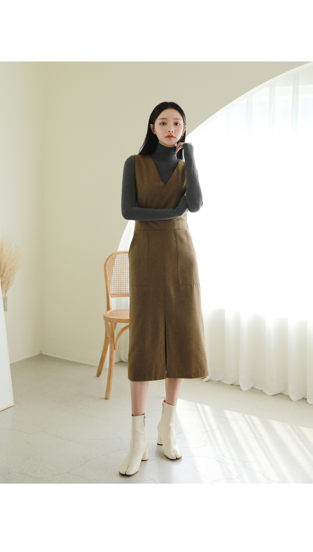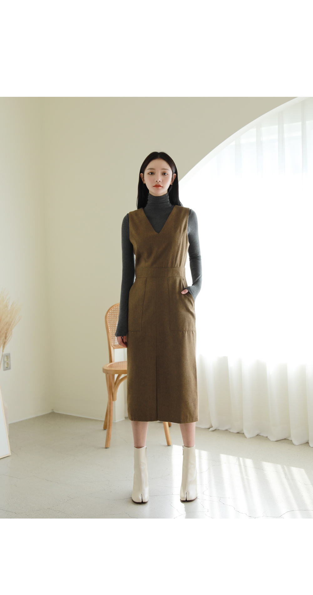 전체적으로 슬림한 H라인에 허리를 잡아주어 날씬해 보이는 원피스입니다.