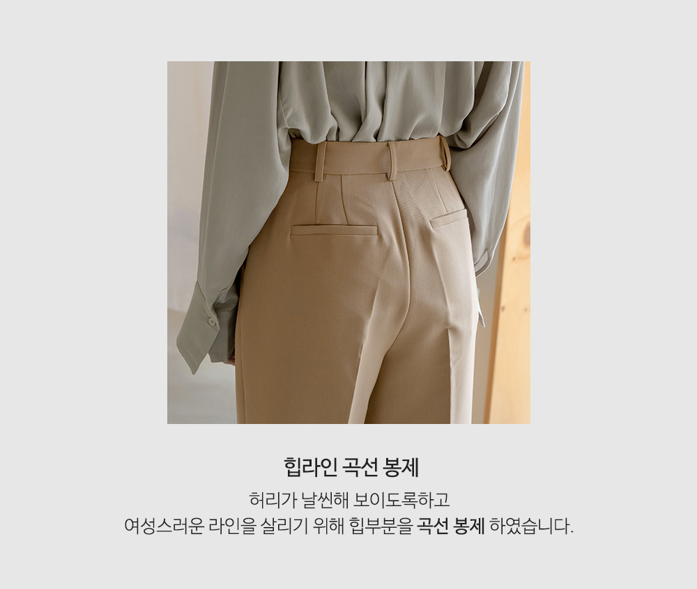 힙양쪽으로는 곡을 주어 여성스러운 라인이 연출되면서도 여유있는 사이즈로 편안합니다.