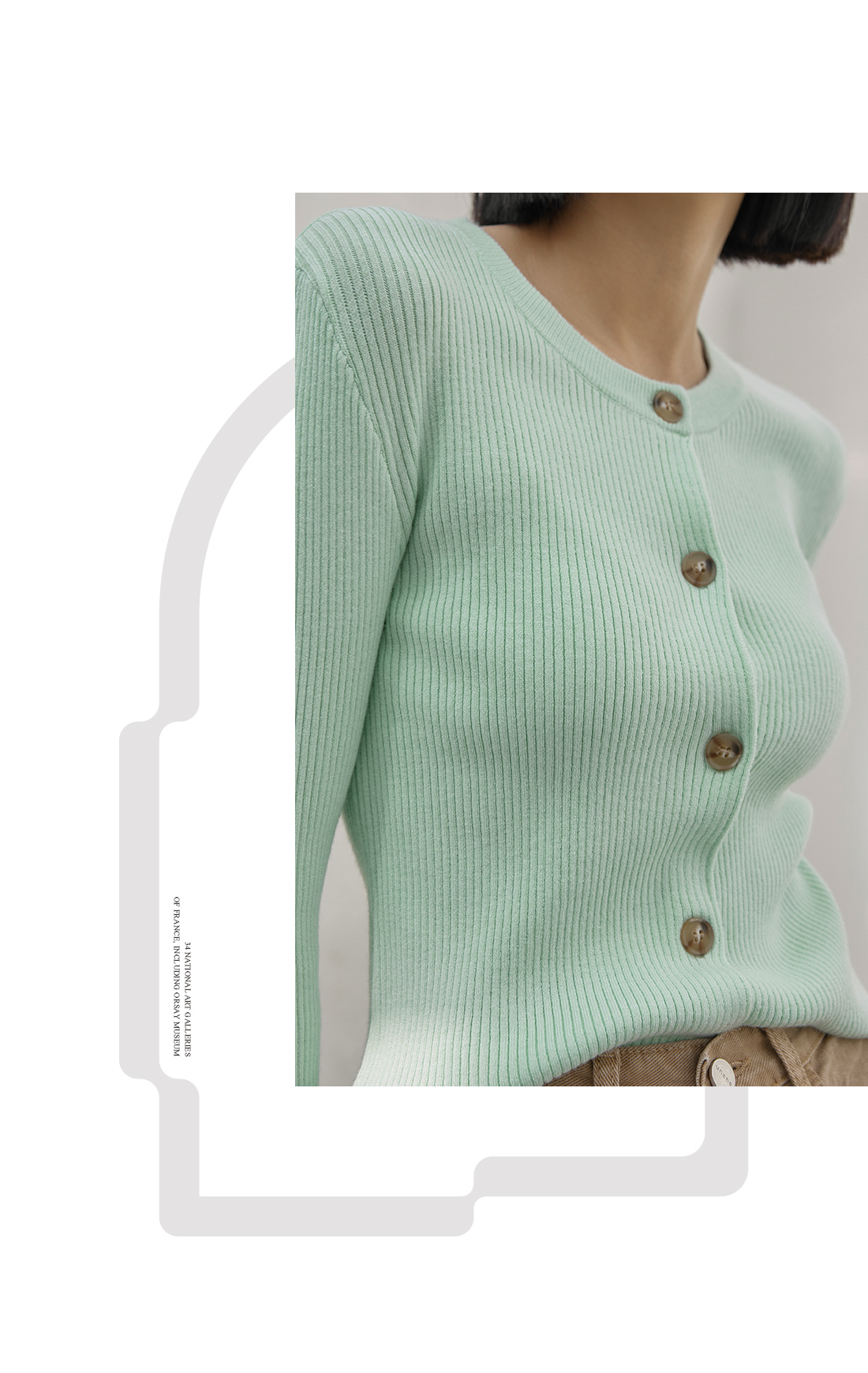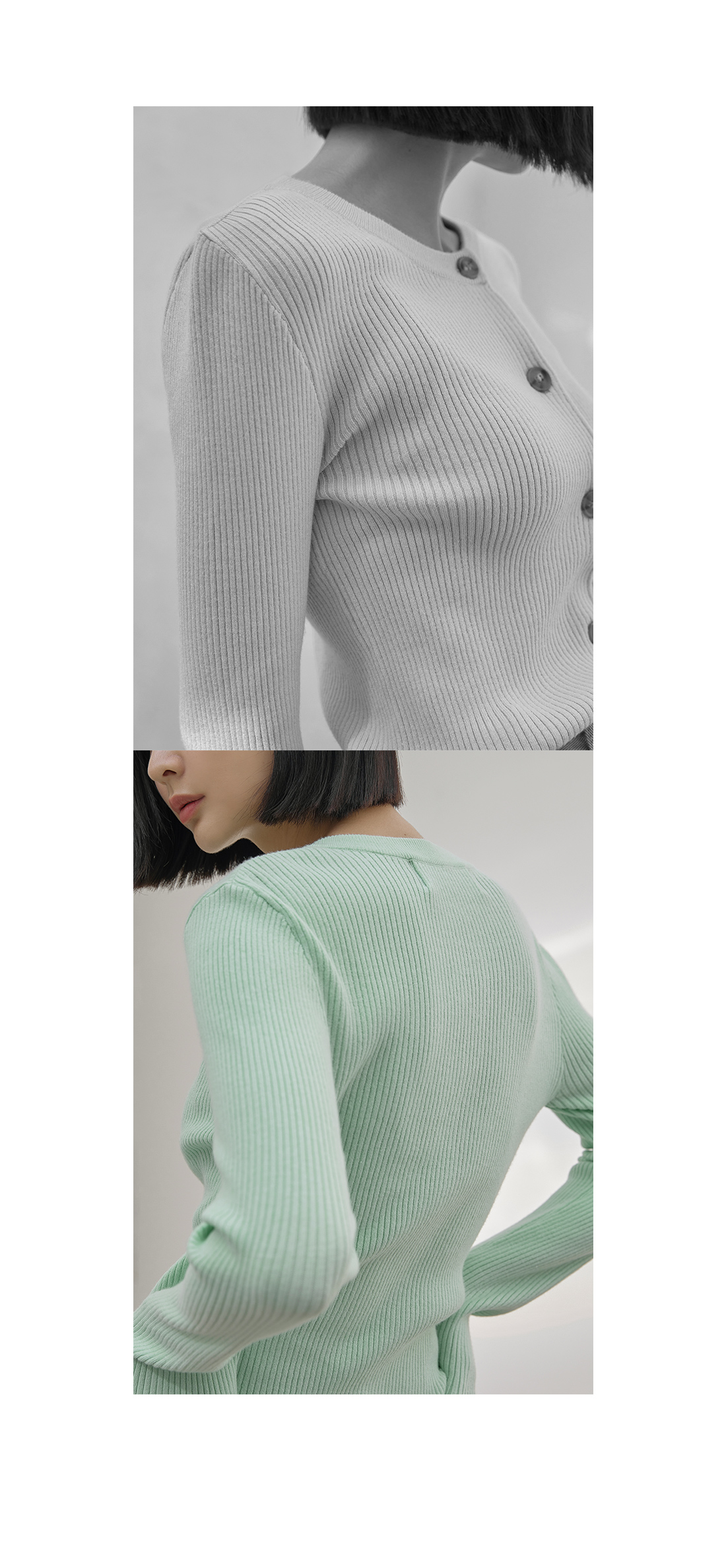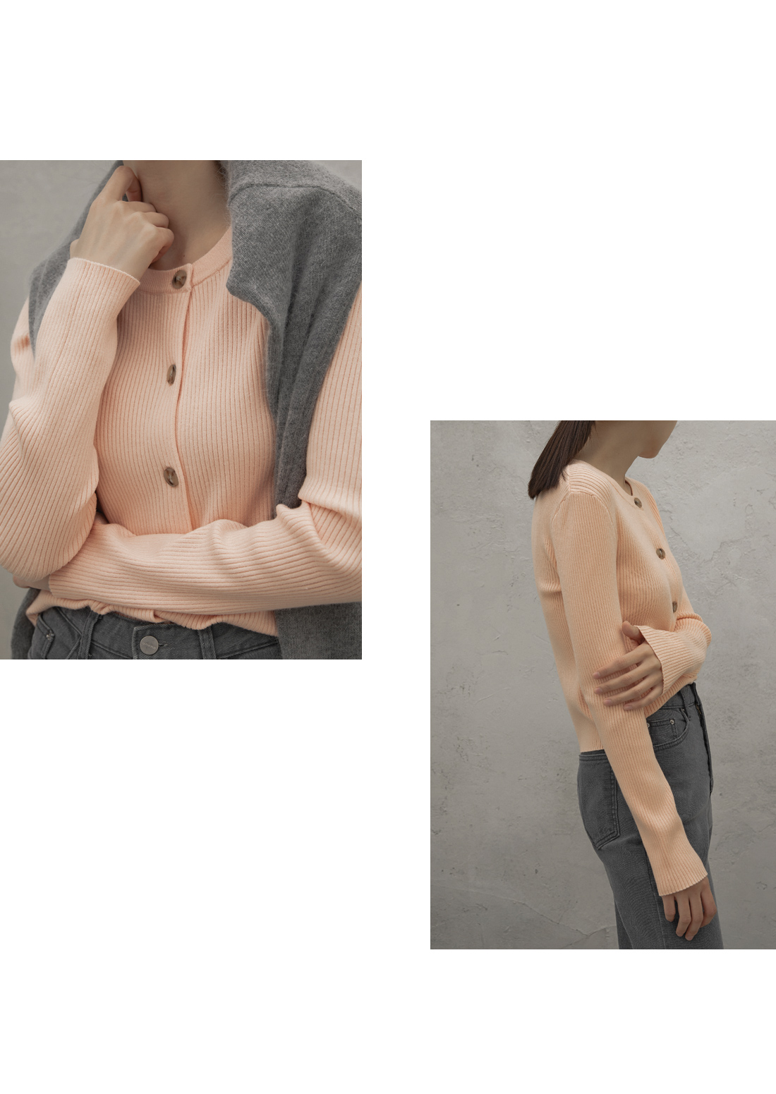 라운드 네크라인에 슬림핏으로 제작된 가디건입니다.
