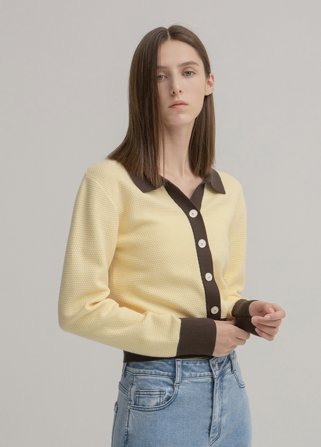 오픈 카라 디자인과 트위드 패턴으로 라이크한 분위기를 나타내며 장식 버튼으로 고급스러움과 페미닌한 무드가 느껴지는 아이템입니다.