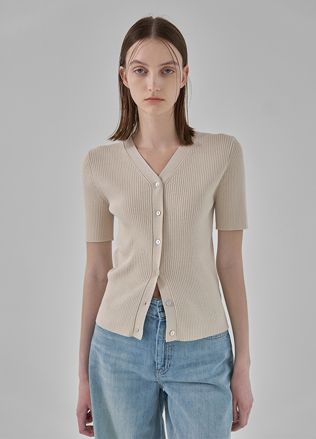 안정적인 브이넥 네크라인이며 베이직한 디자인과 골지 짜임이 돋보여 슬림 해 보이는 효과를 나타내고, 모던하면서도 페미닌한 무드를 나타냅니다.