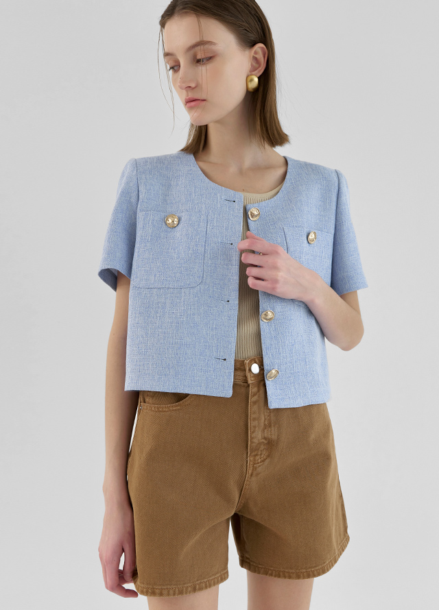 뉴 노멀 셋업 트위드 자켓입니다. 시원한 폴리 소재로 만들어진 트위드 자켓이며, 크롭한 기장감과 깊게 파인 U넥이 여름에도 부담없이 즐길 수 있습니다.