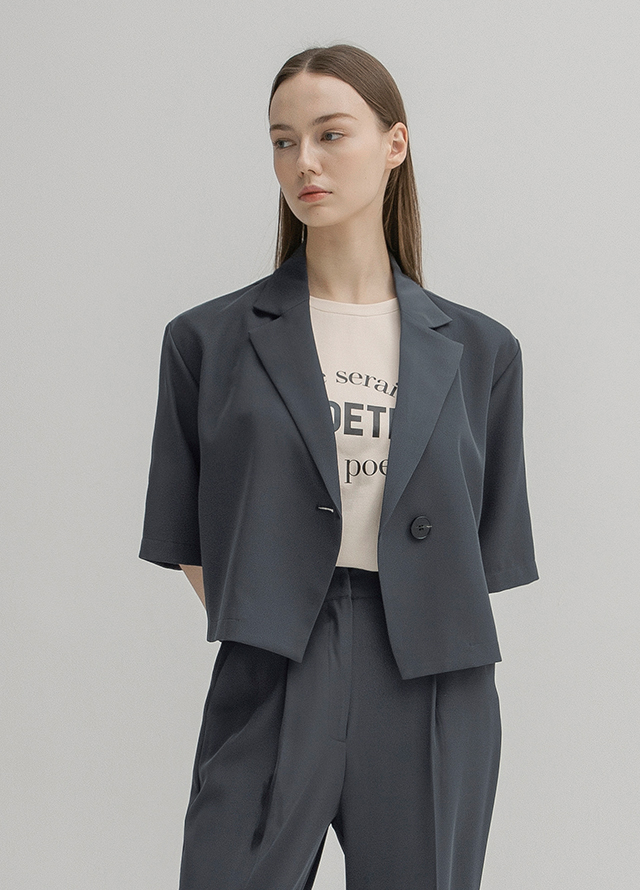 가볍고 시원한 소재감에 허리까지 오는 크롭한 기장감이 포인트인 자켓입니다.