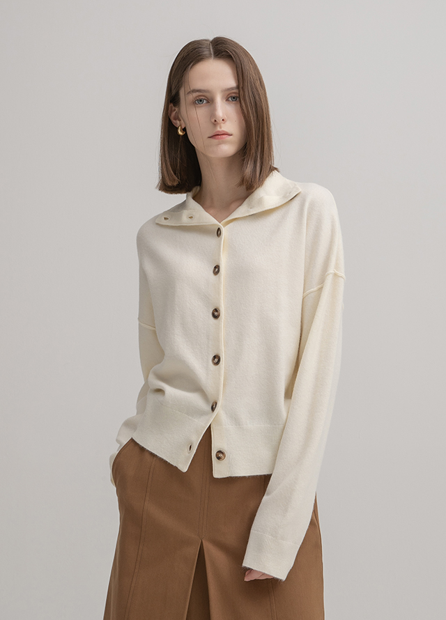 드롭된 숄더와 오버핏 실루엣으로 캐주얼한 바디감을 가지고 있으며, 카라디자인과 이어지는 넥 라인의 버튼 포인트로 단추를 모두 채워 폴라 형태, 또는 모두 오픈하여 일반 카라형태로 착용이 가능한 아이템입니다.