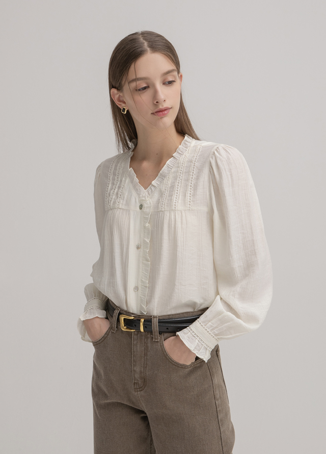 브이넥에서 단작으로 이어지는 프릴단과 요크의 레이스 장식,