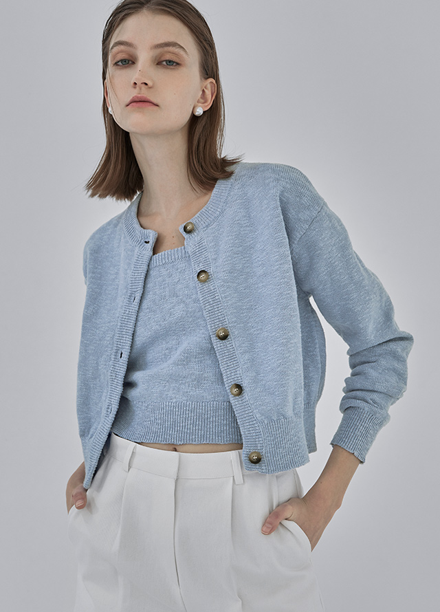크롭한 기장감으로 착용시 다리가 길어보이며, 바디라인을 잘 잡아주는 탑과 살짝 루즈한 핏감의 가디건으로 체형의 군살을 잘 커버해주어 여리여리한 느낌까지 들게 해줍니다.