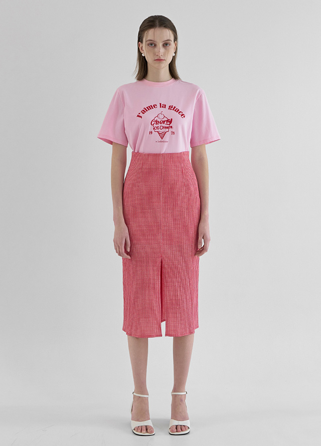 깅엄 시어서커 슬릿 미디 스커트 입니다. 시어서커만의 라이트한 소재감이 돋보이는 세미 H라인의 미디스커트 입니다.