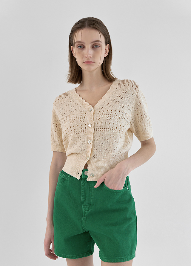 스카시 레이스 부클 크롭 니트 가디건 입니다. 폴리에스터, 아크릴, 나일론, 레이온이 섞인 부드러운 부클 소재로 제작되어 착용감이 가볍고 부드러운 아이템입니다.