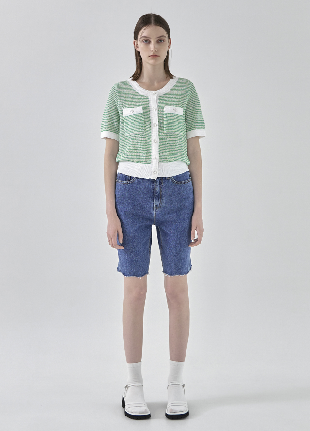클래식한 컬러감의 데님 워싱과 레그라인을 슬림하게 잡아주는 핏의 하프 데님 팬츠 아이템입니다.