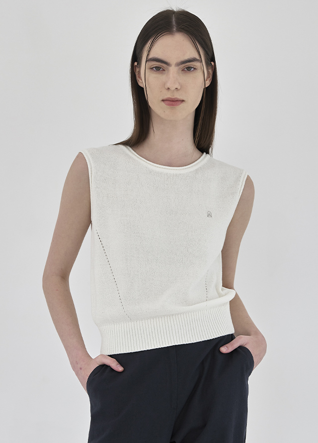 썸머 부클 보트넥 슬리브리스 니트 입니다.