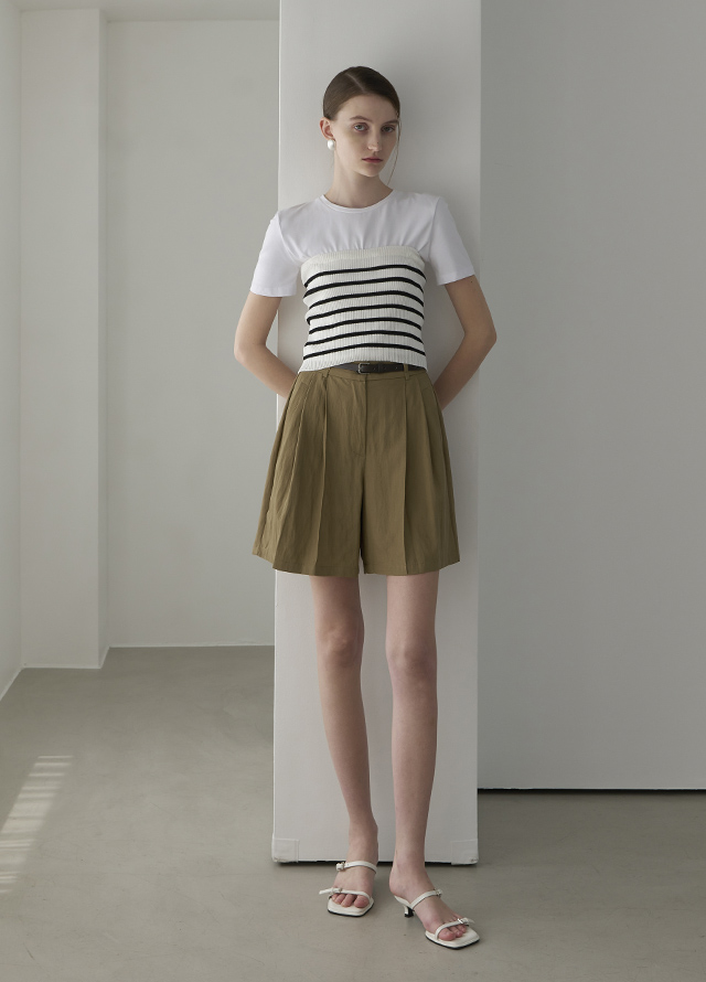 네추럴한 소재감과 함께 허리아래로 떨어지는 핀턱 디테일이 포인트인 하프 팬츠입니다.