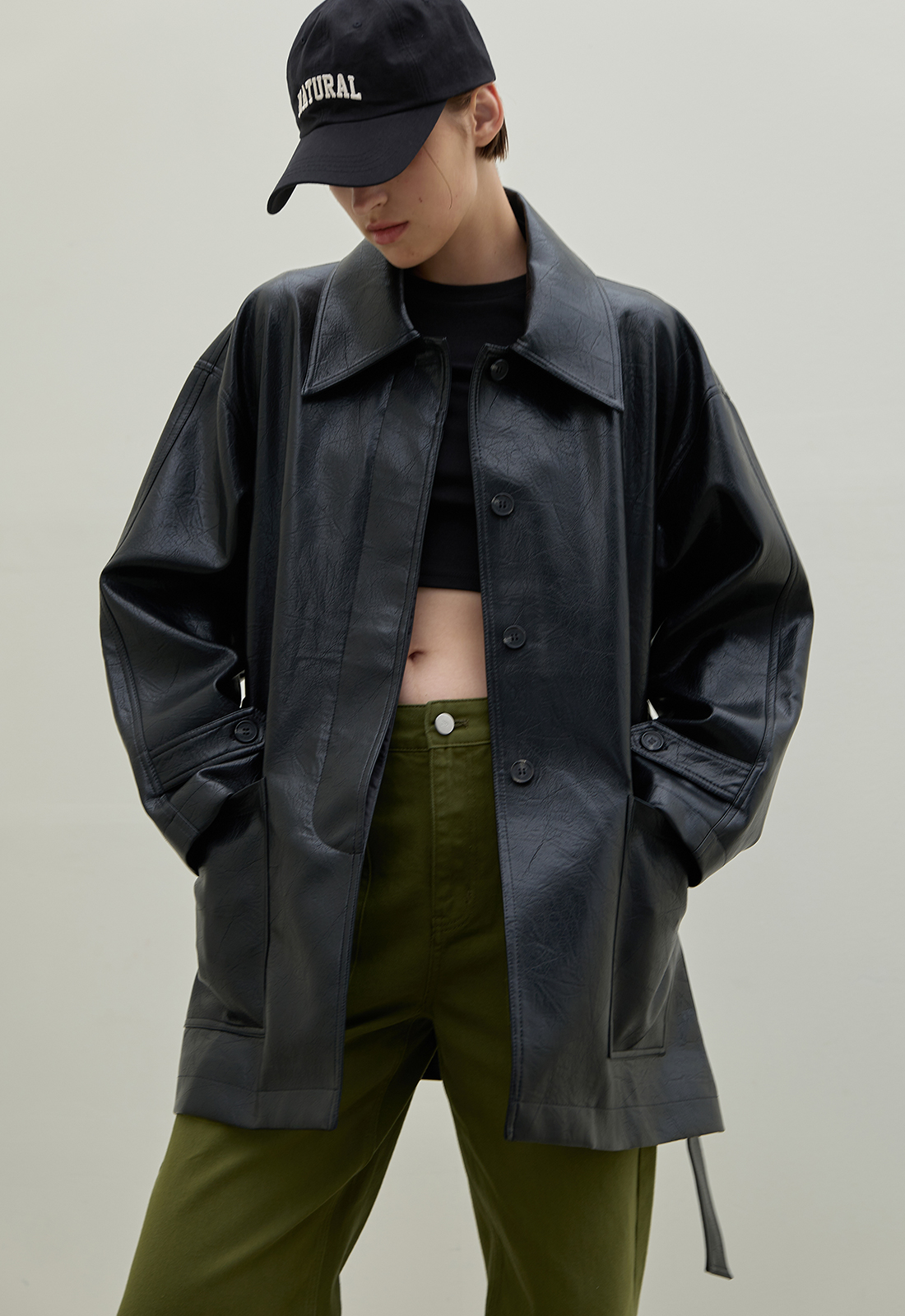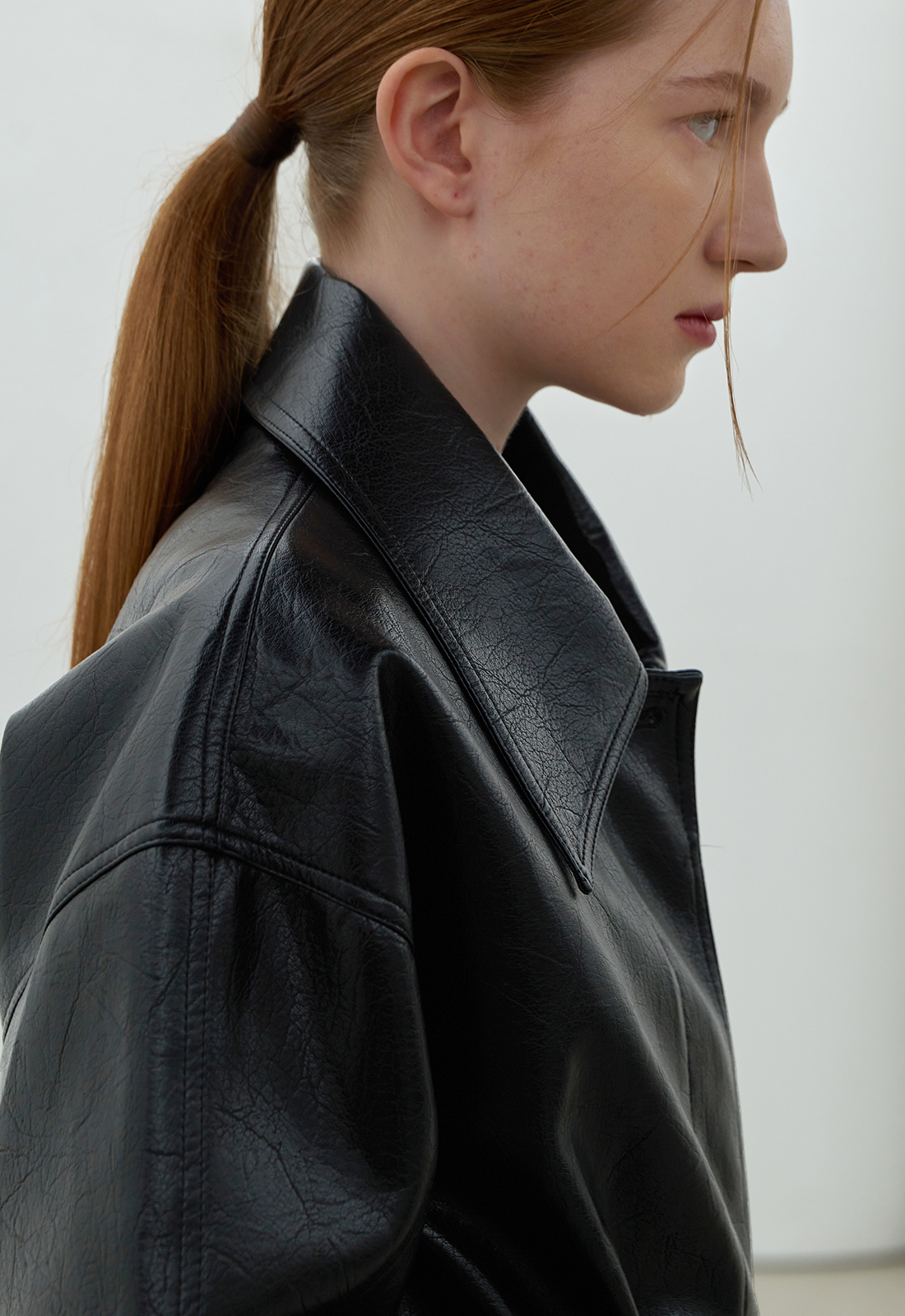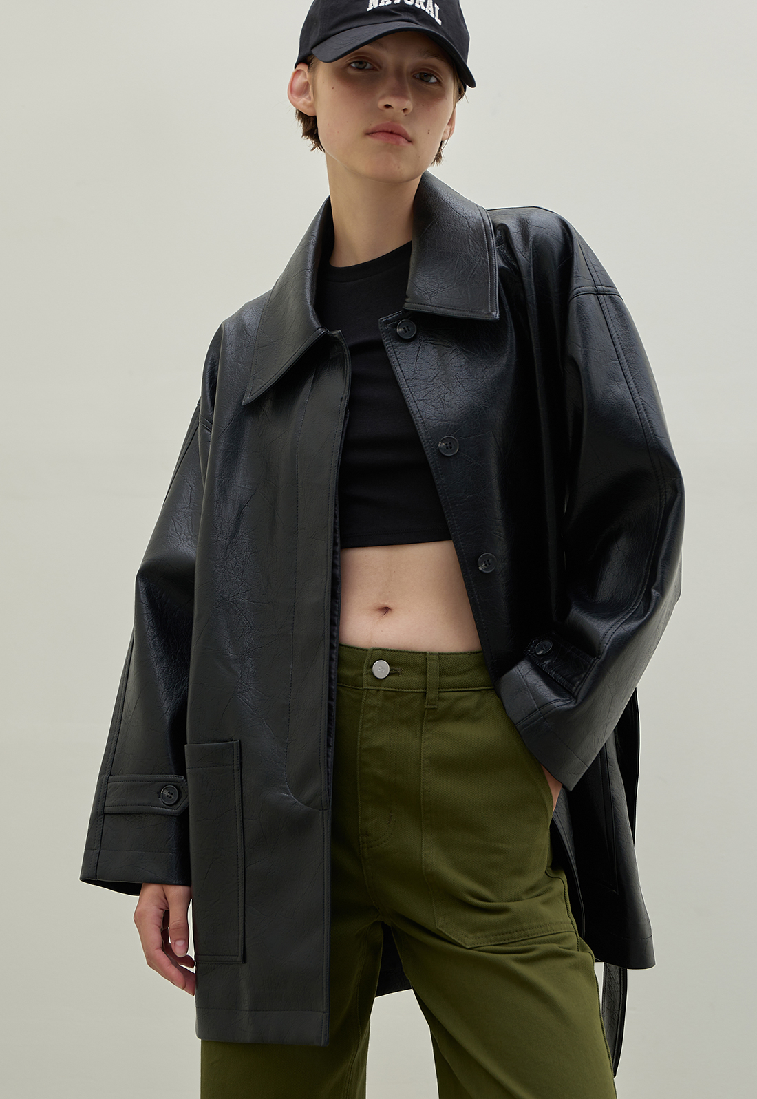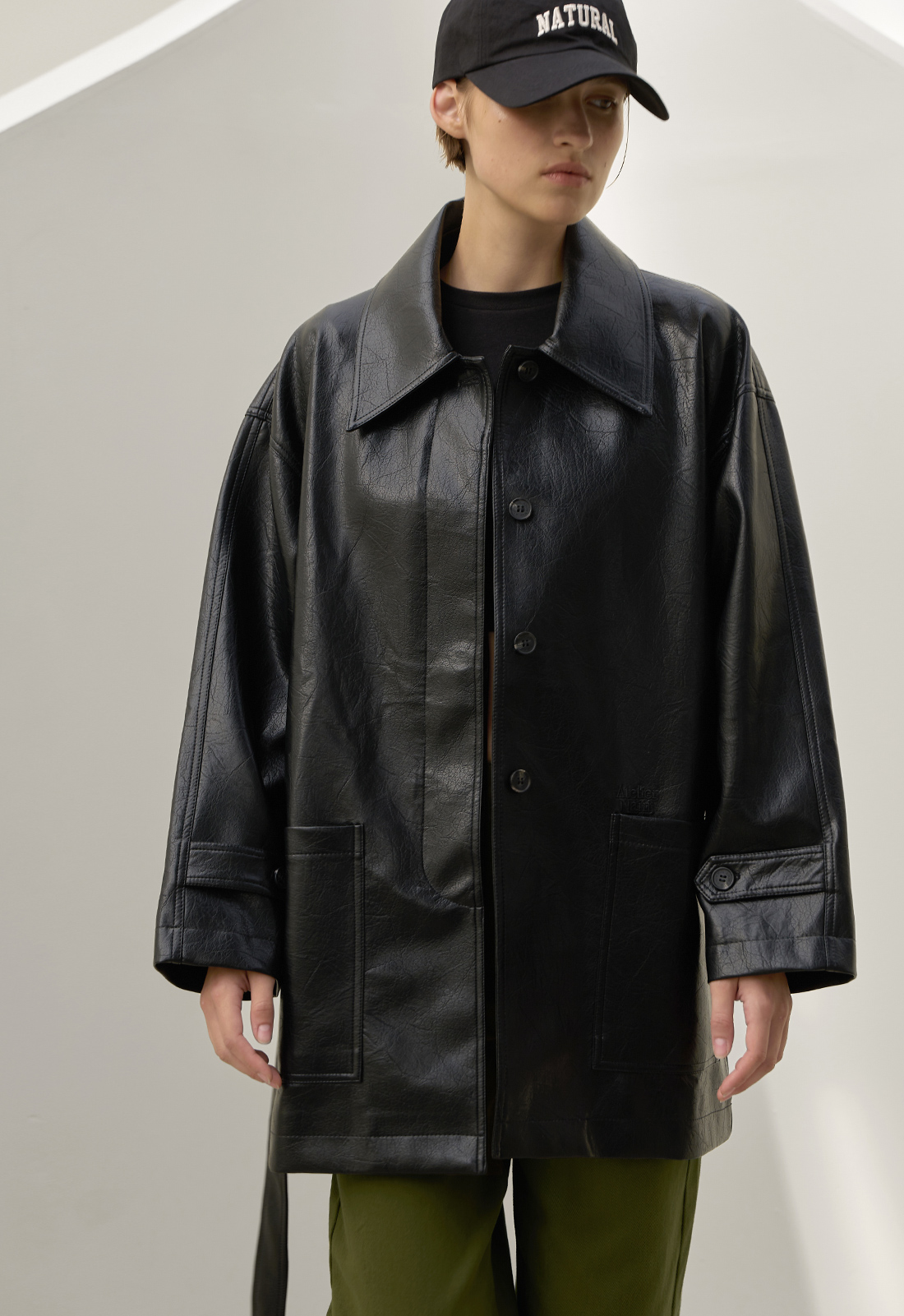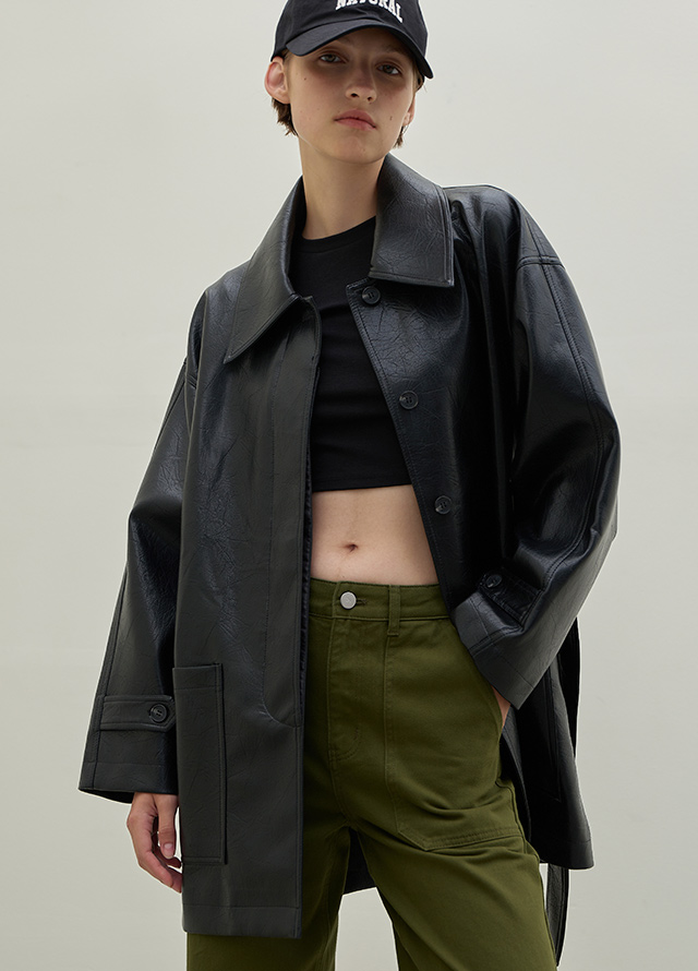 페이크 레더 소재에 하프한 기장감과 루즈한 실루엣이 더해져
