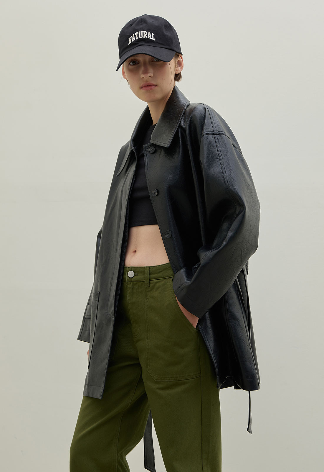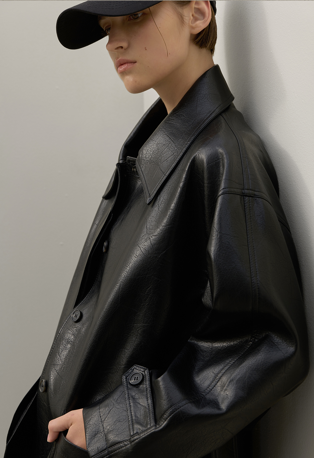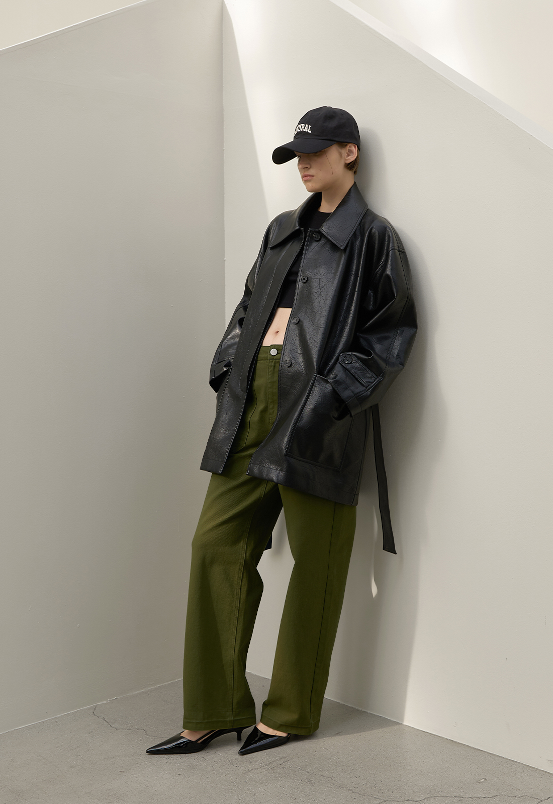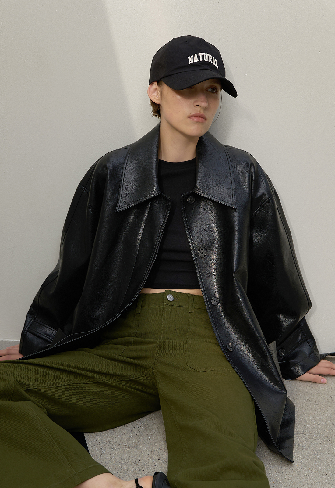 페이크 레더 소재에 하프한 기장감과 루즈한 실루엣이 더해져
