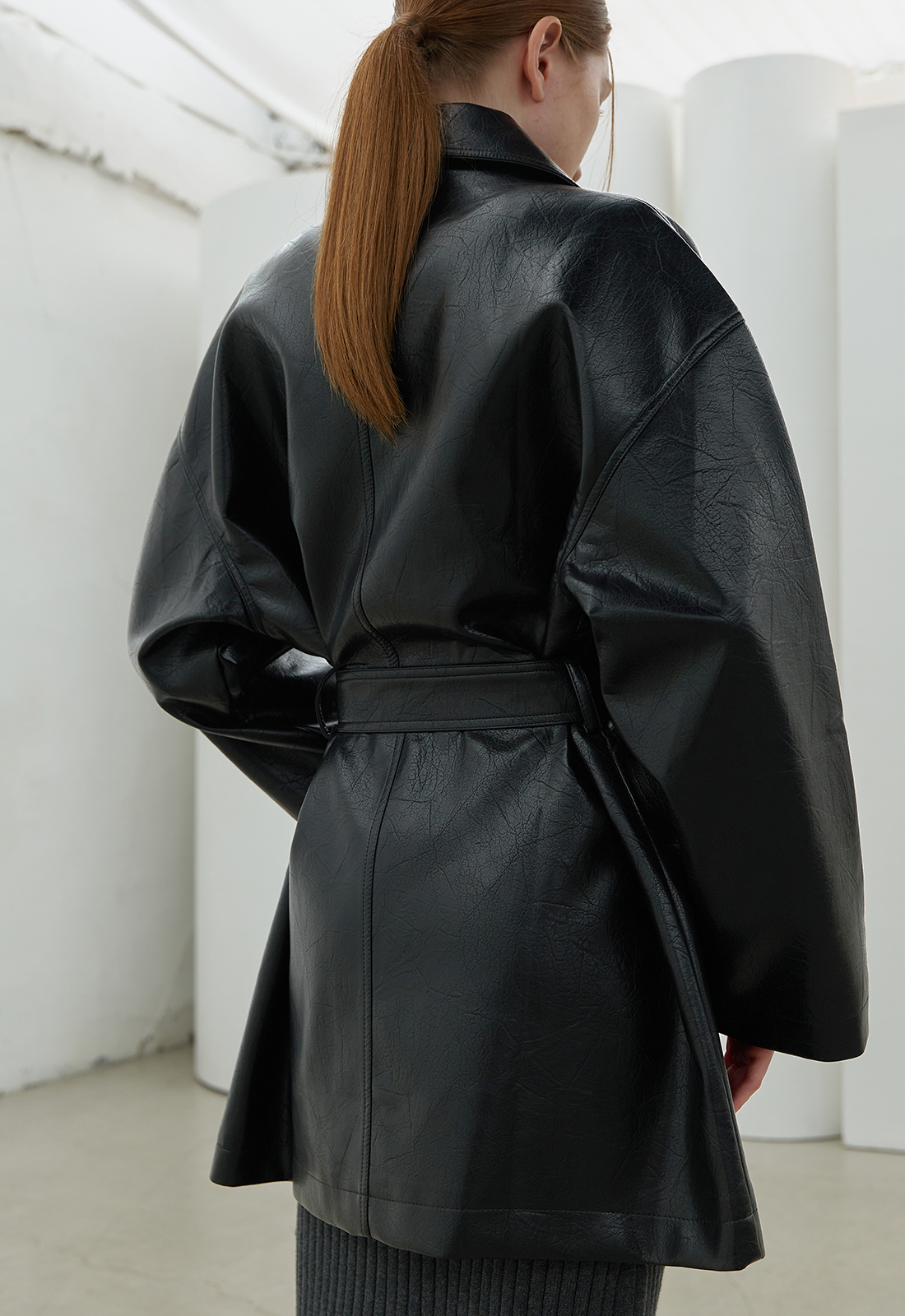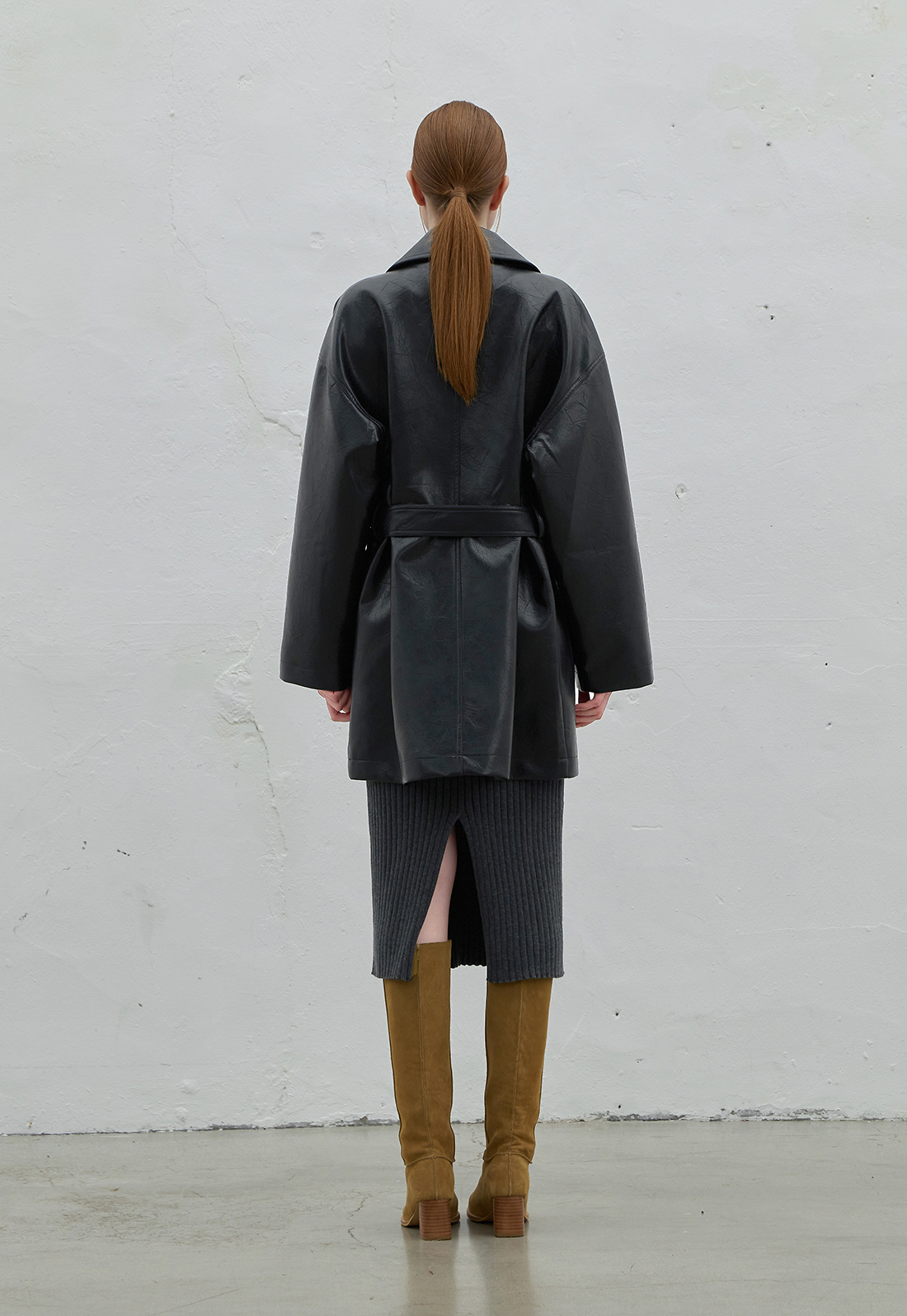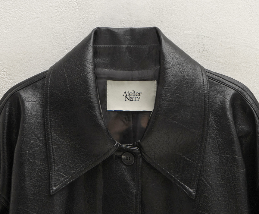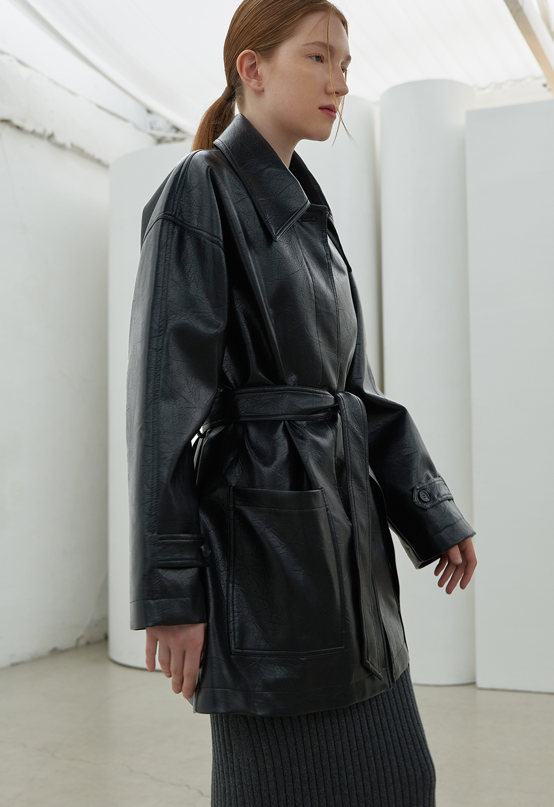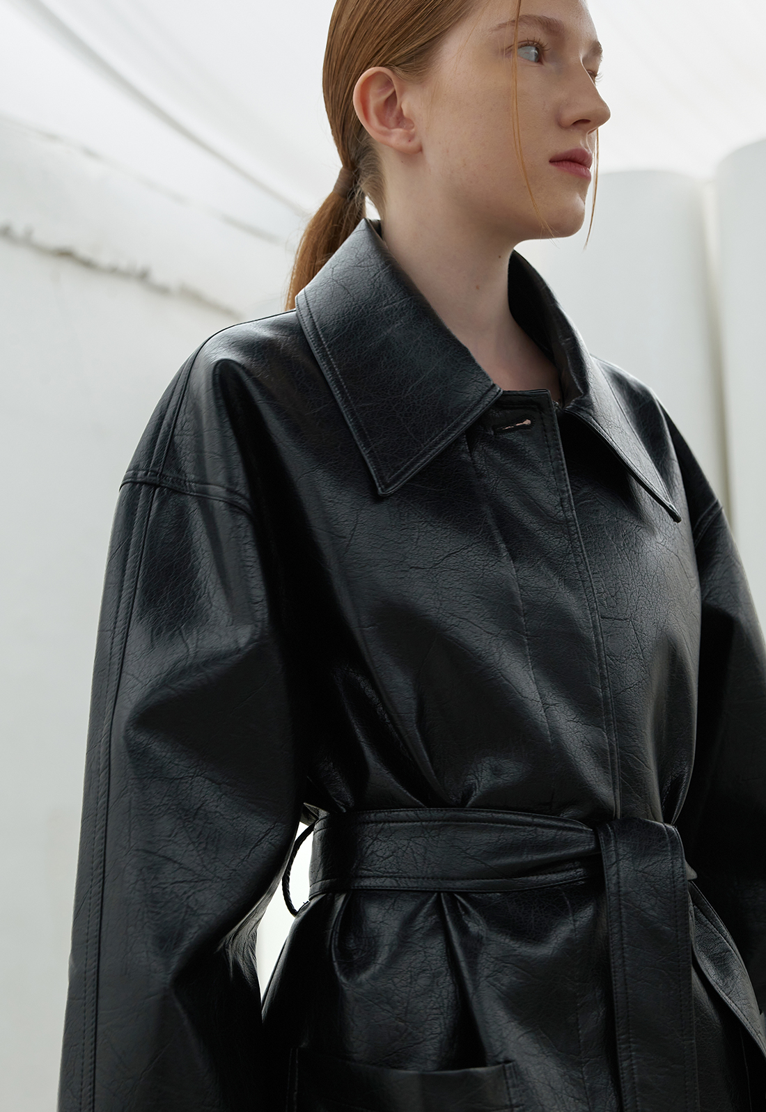 페이크 레더 소재에 하프한 기장감과 루즈한 실루엣이 더해져