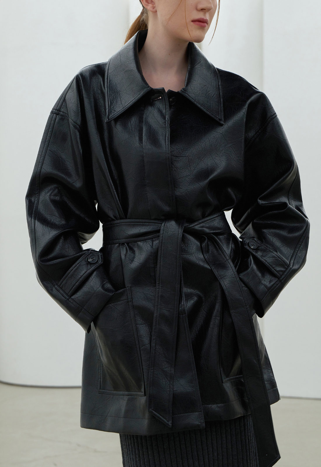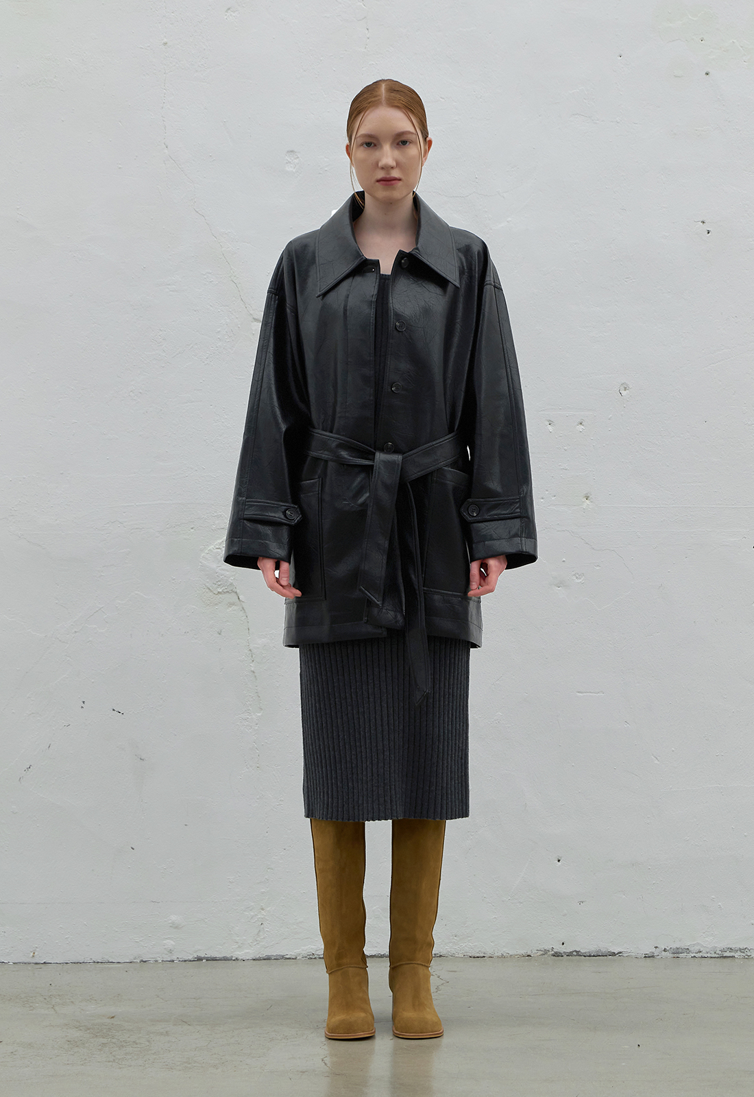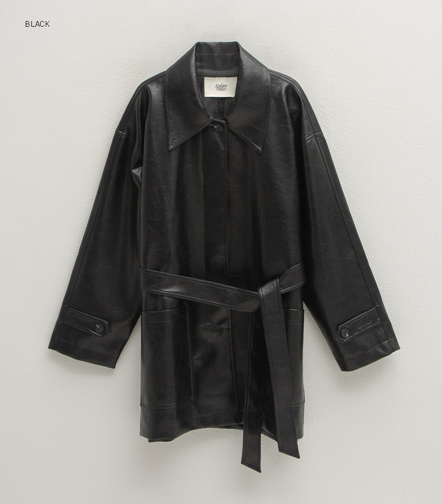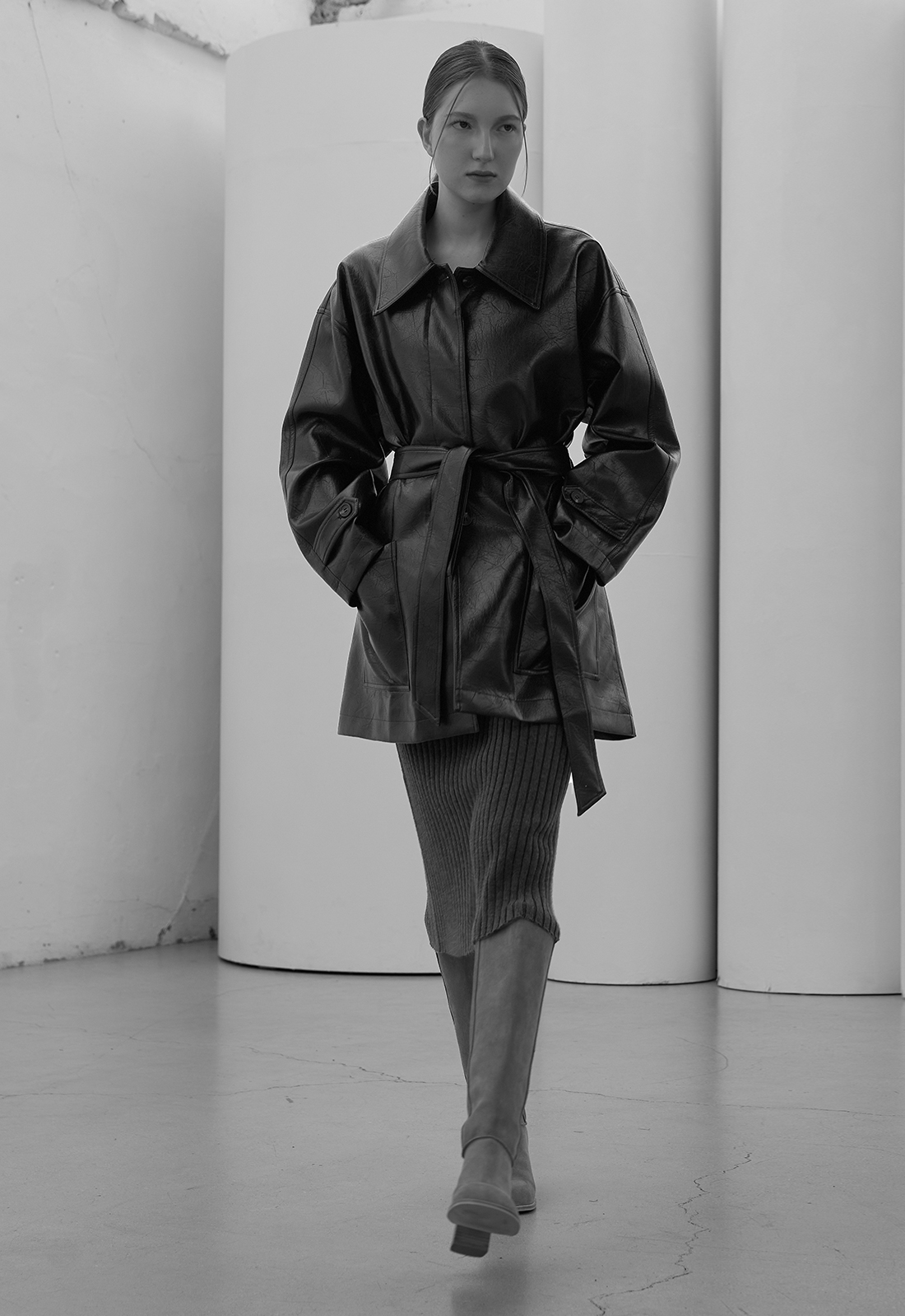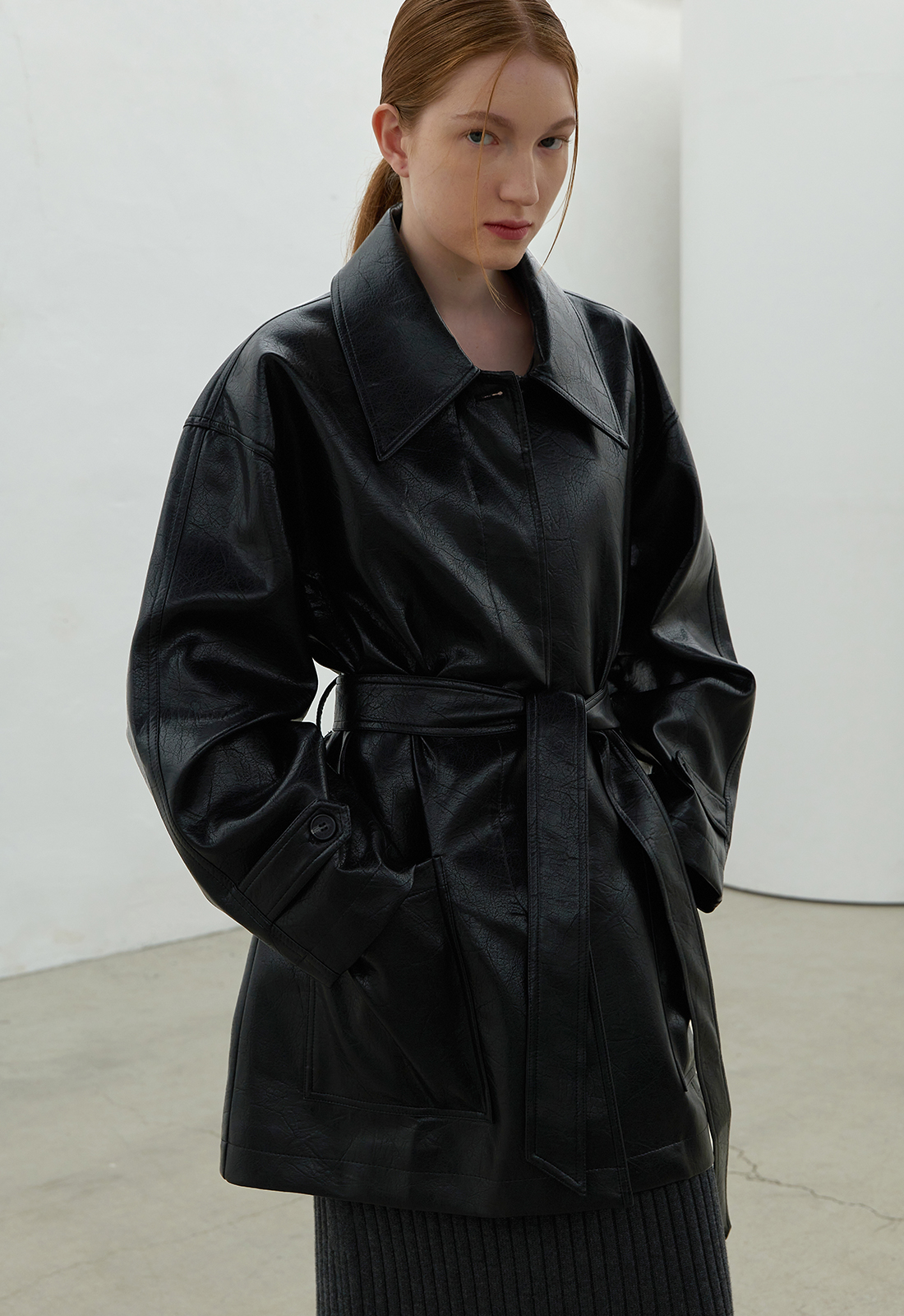 페이크 레더 소재에 하프한 기장감과 루즈한 실루엣이 더해져