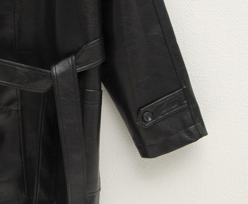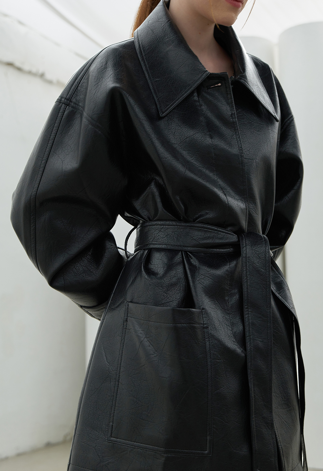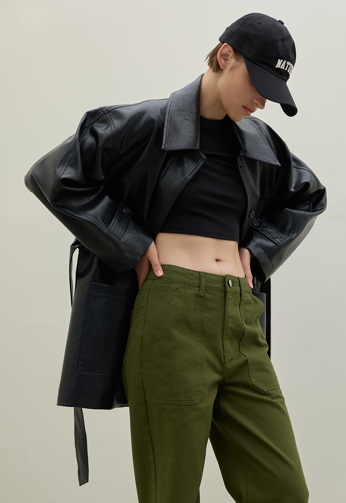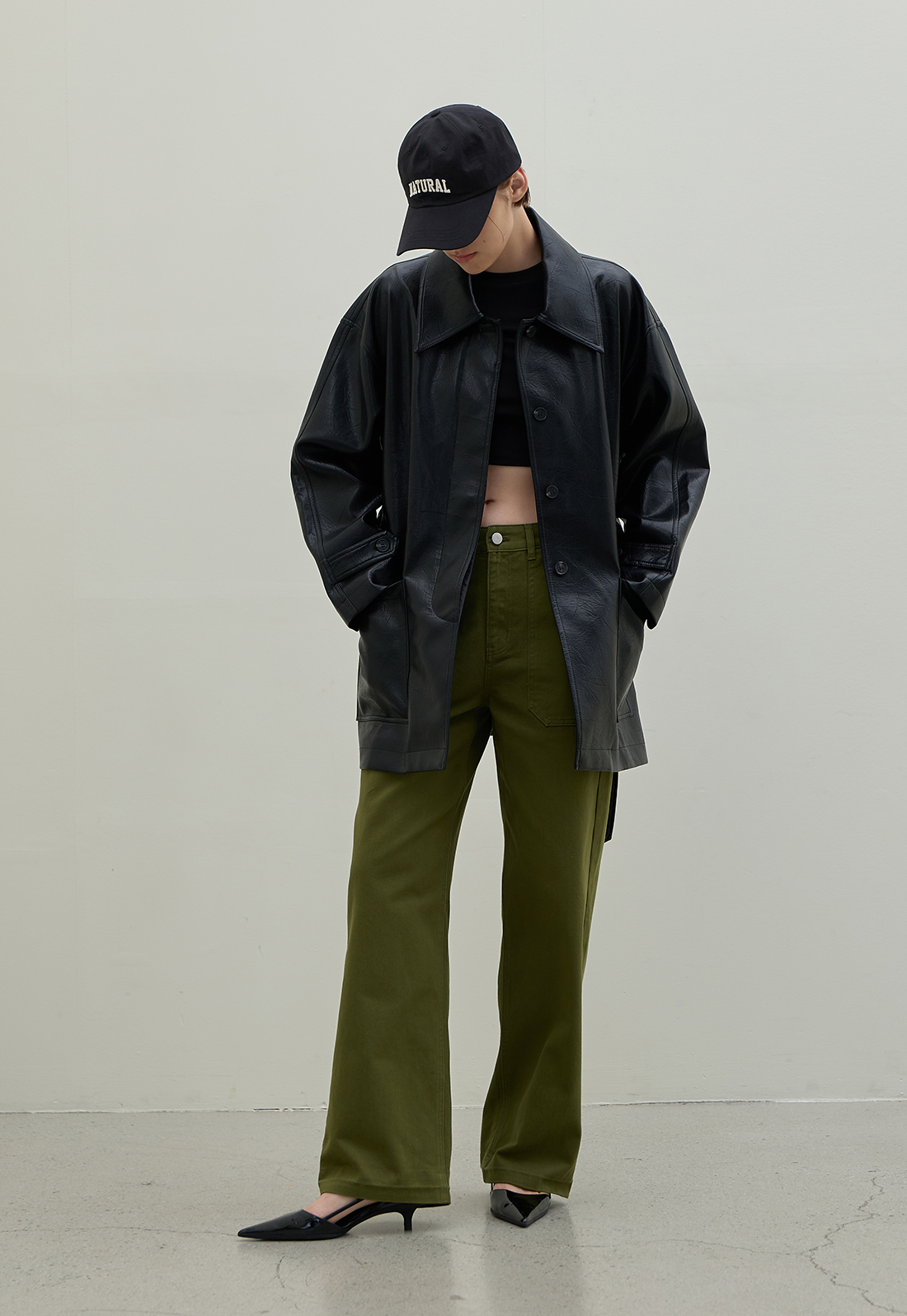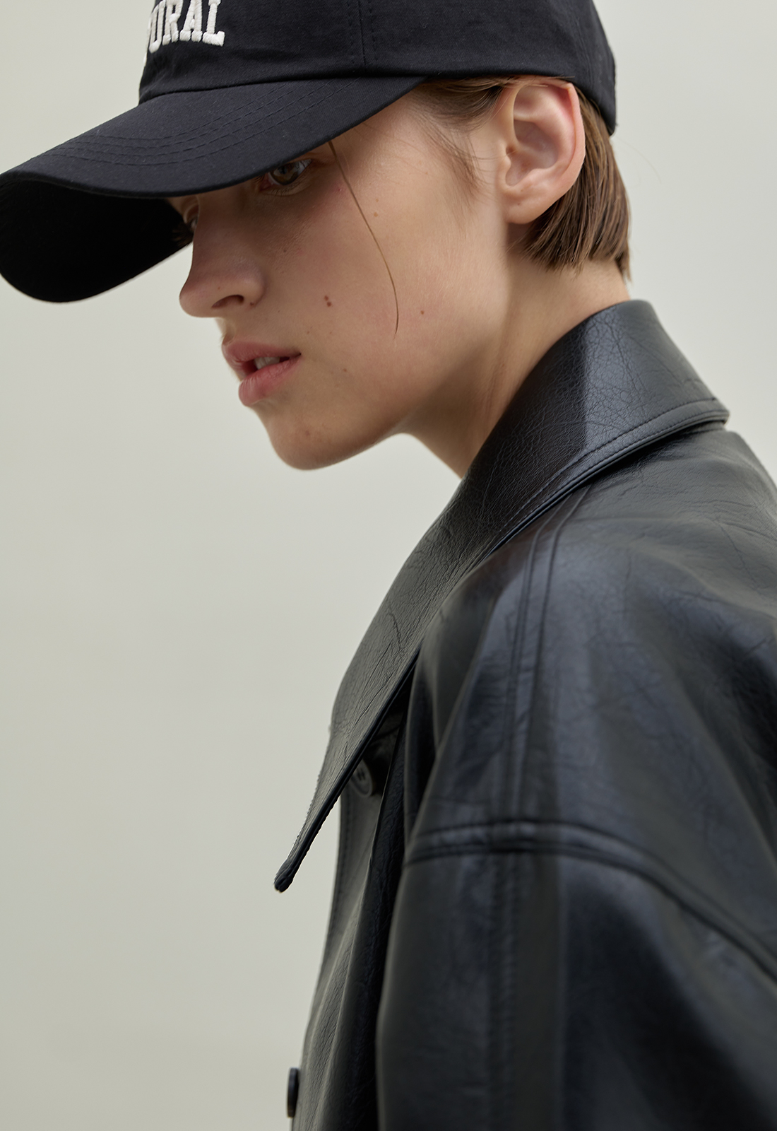 페이크 레더 소재에 하프한 기장감과 루즈한 실루엣이 더해져