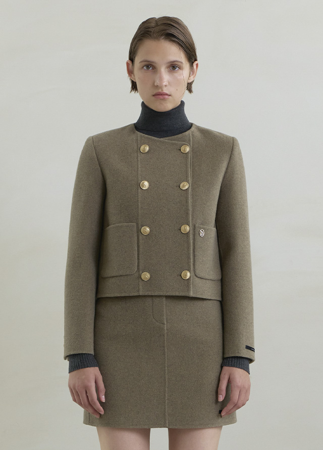 더블 브레스트와 라운드넥의 단정한 실루엣이 돋보이는 자켓입니다.
