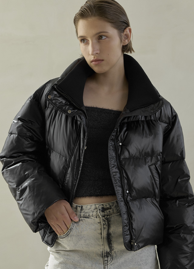 웰론 충전재로 제작된 하이넥 숏기장 패딩점퍼입니다.