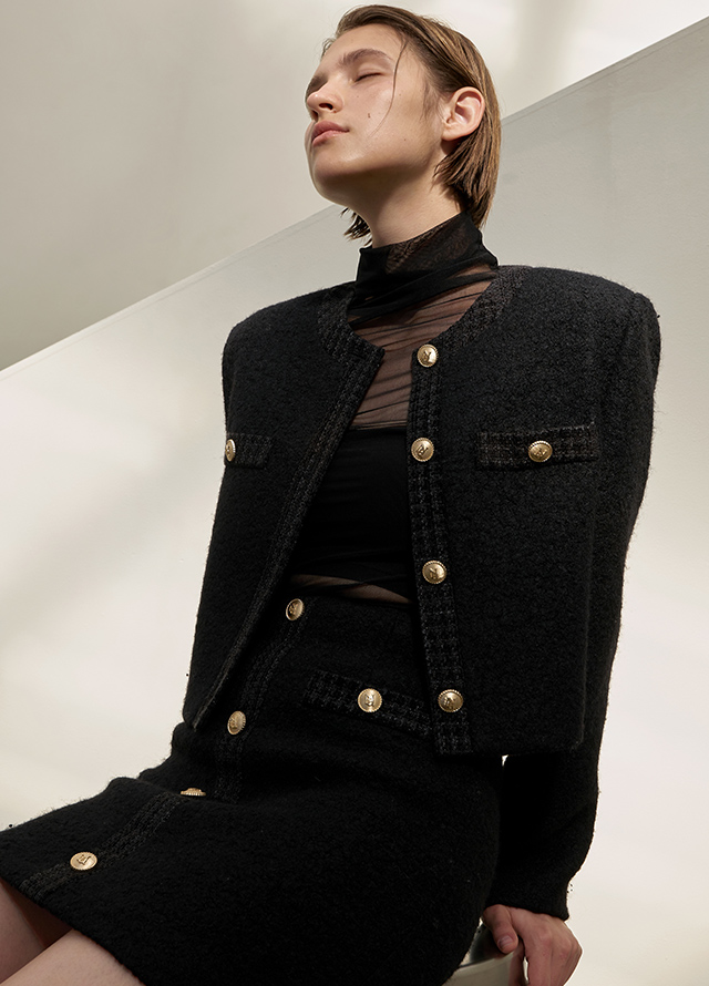 금속버튼으로 포인트를 주었으며, 배색 트위드 디자인으로