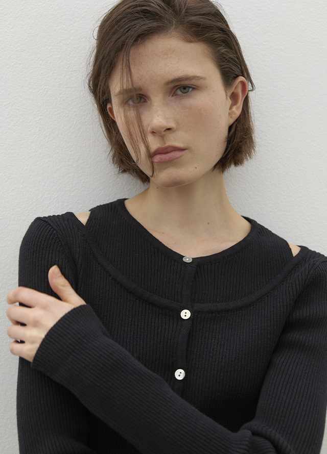 레이어링한 듯한 독특한 디자인의 골지 슬림 가디건 입니다.