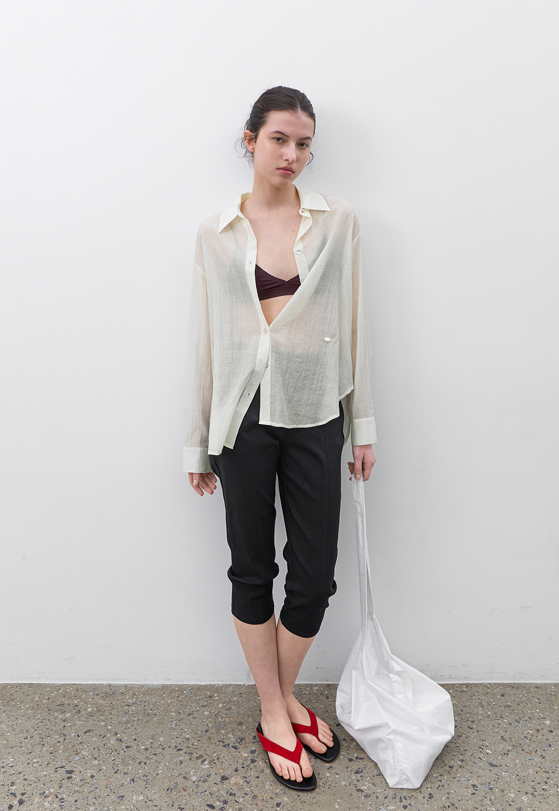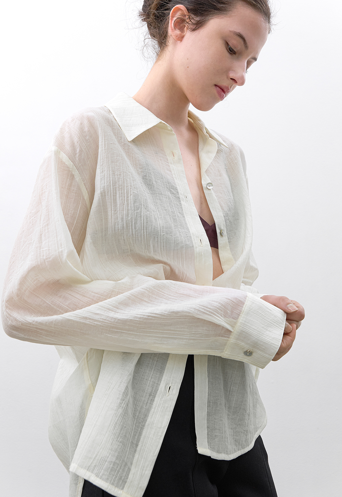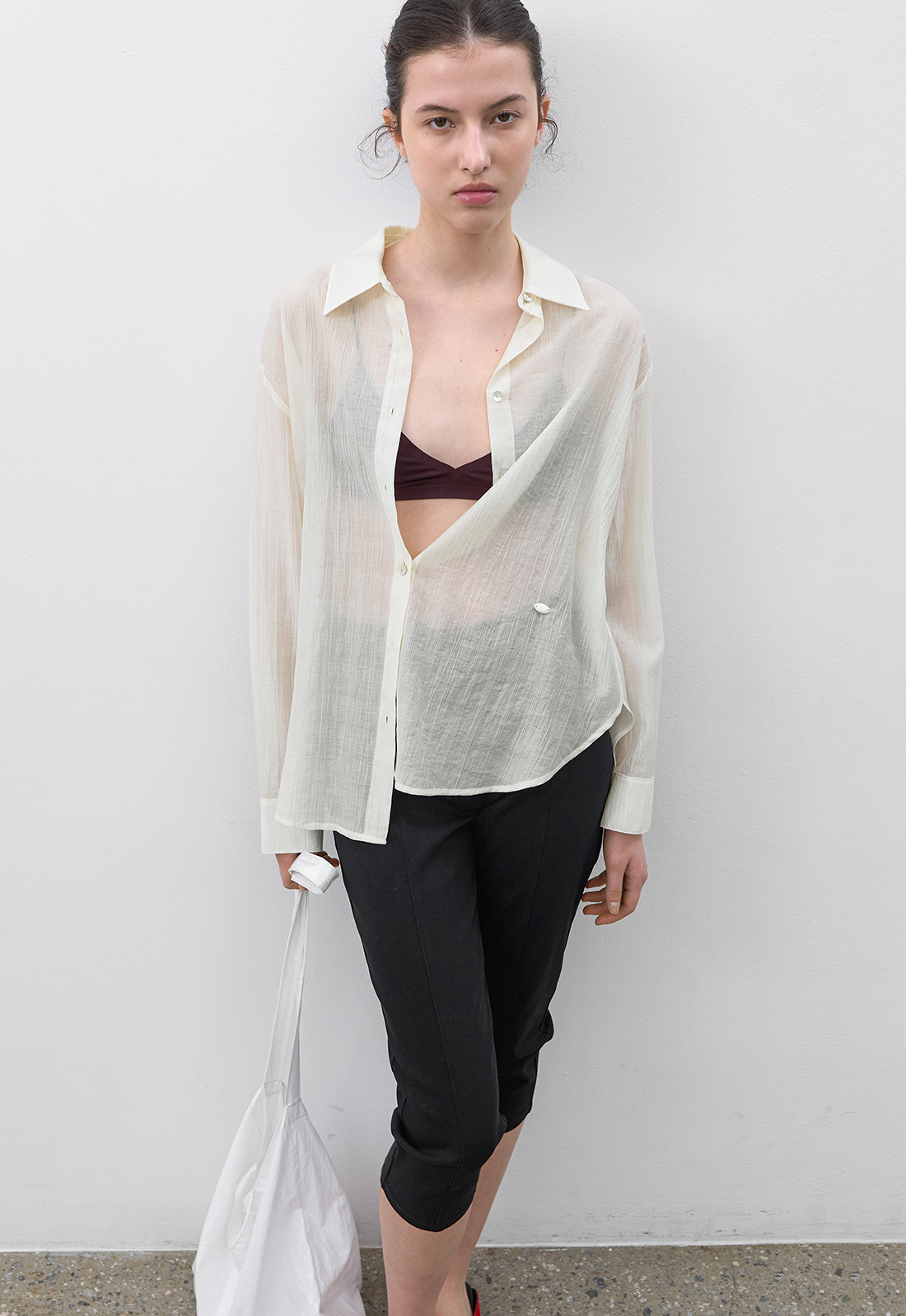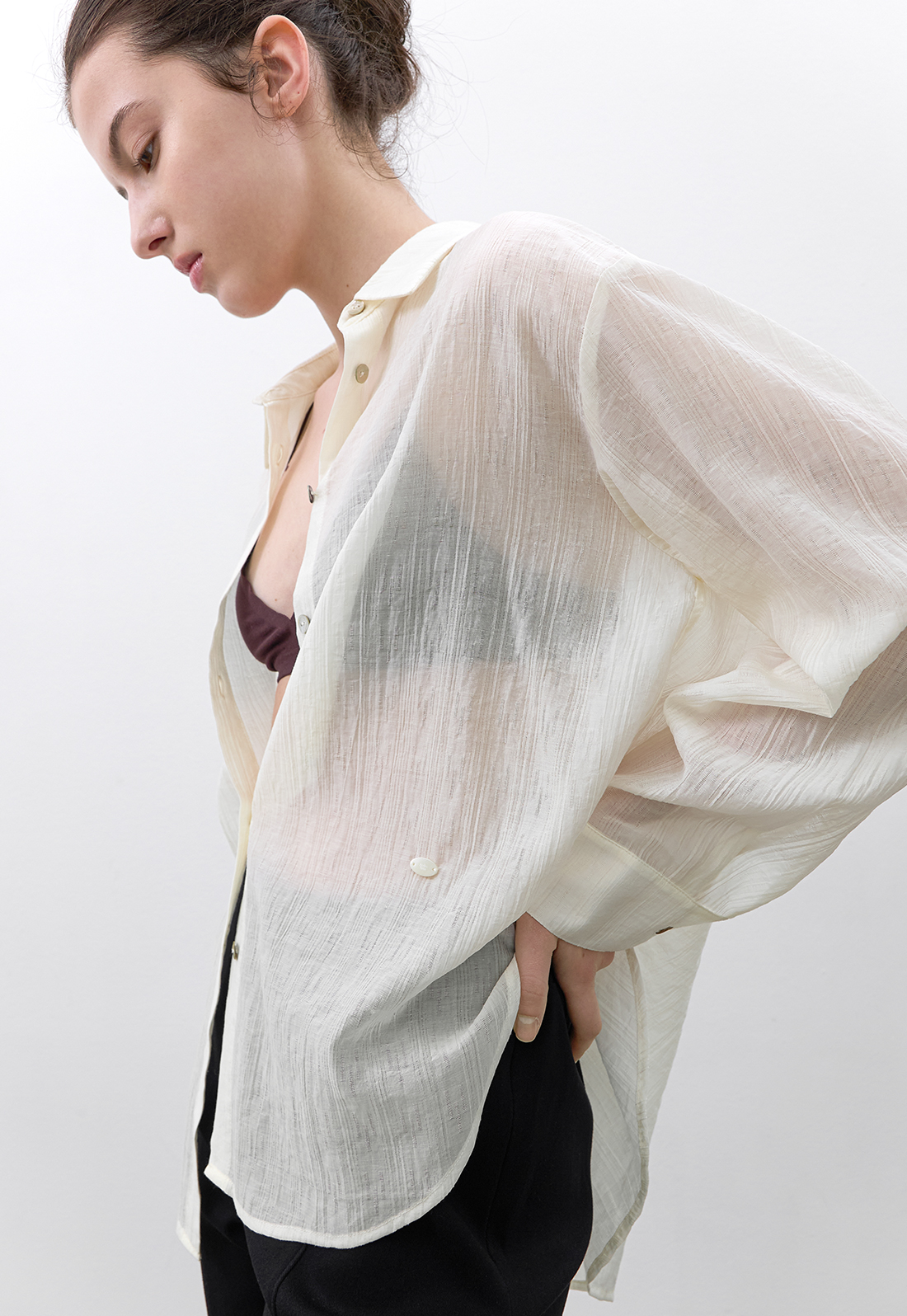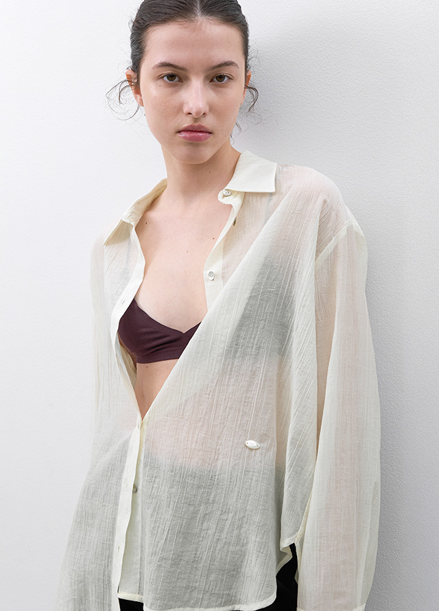 시어한 소재감과 박시한 핏의 블라우스로 다양하게 활용하기 좋으며,