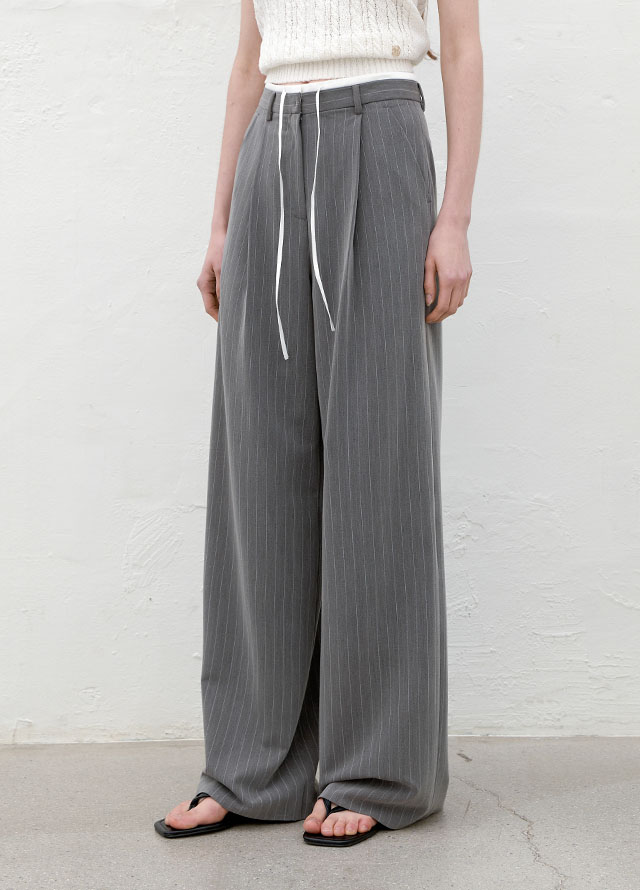 스트라이프 원단의 핀턱 와이드 팬츠입니다.