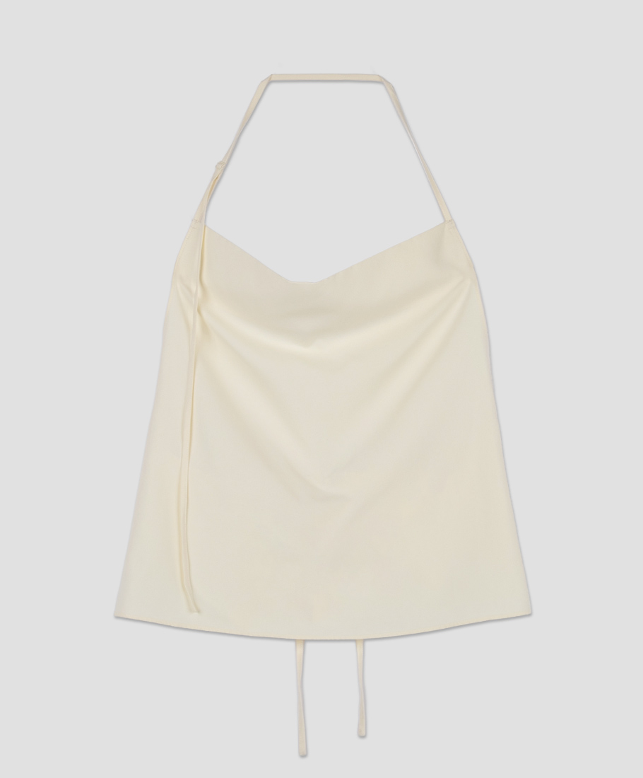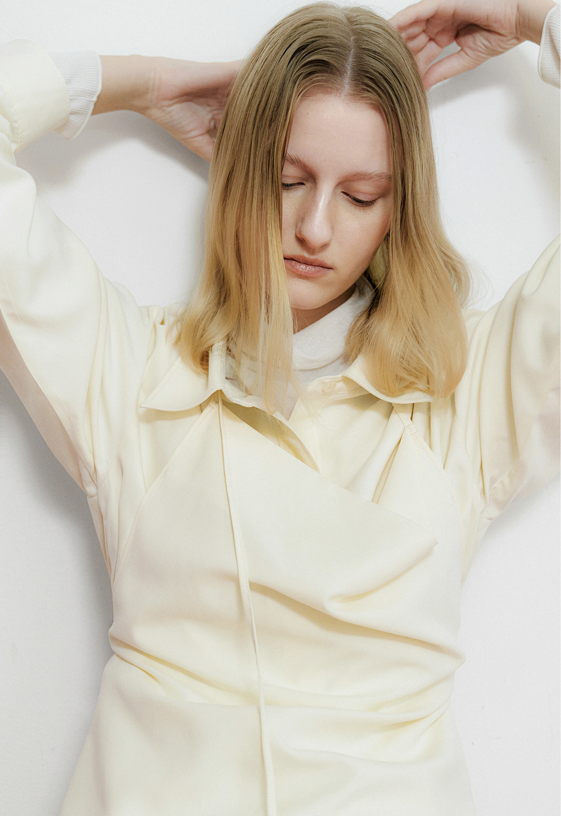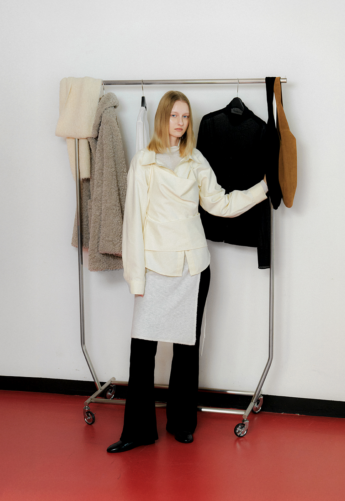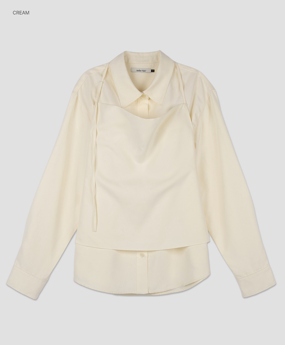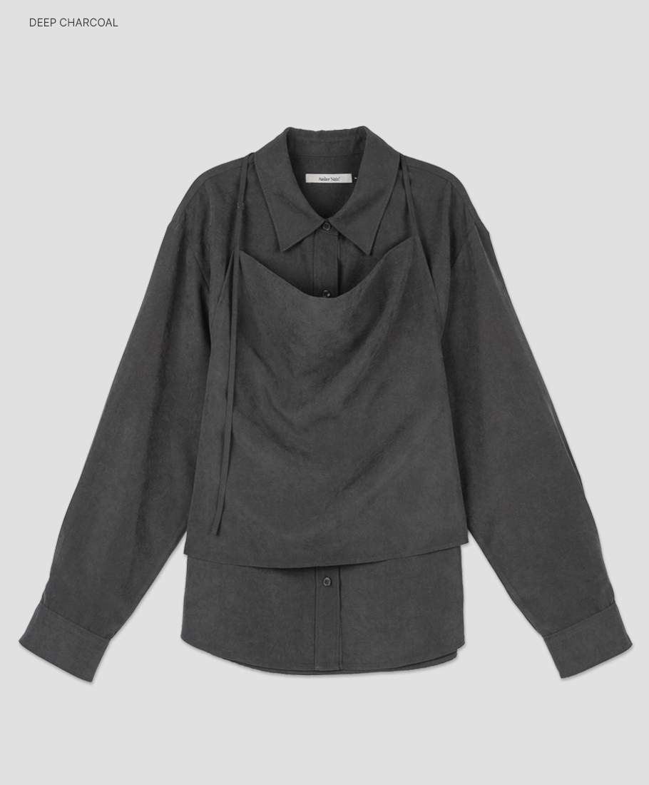 드레이프 실루엣의 홀터넥 슬리브리스와 루즈한 셔츠가 조화를 이루어
