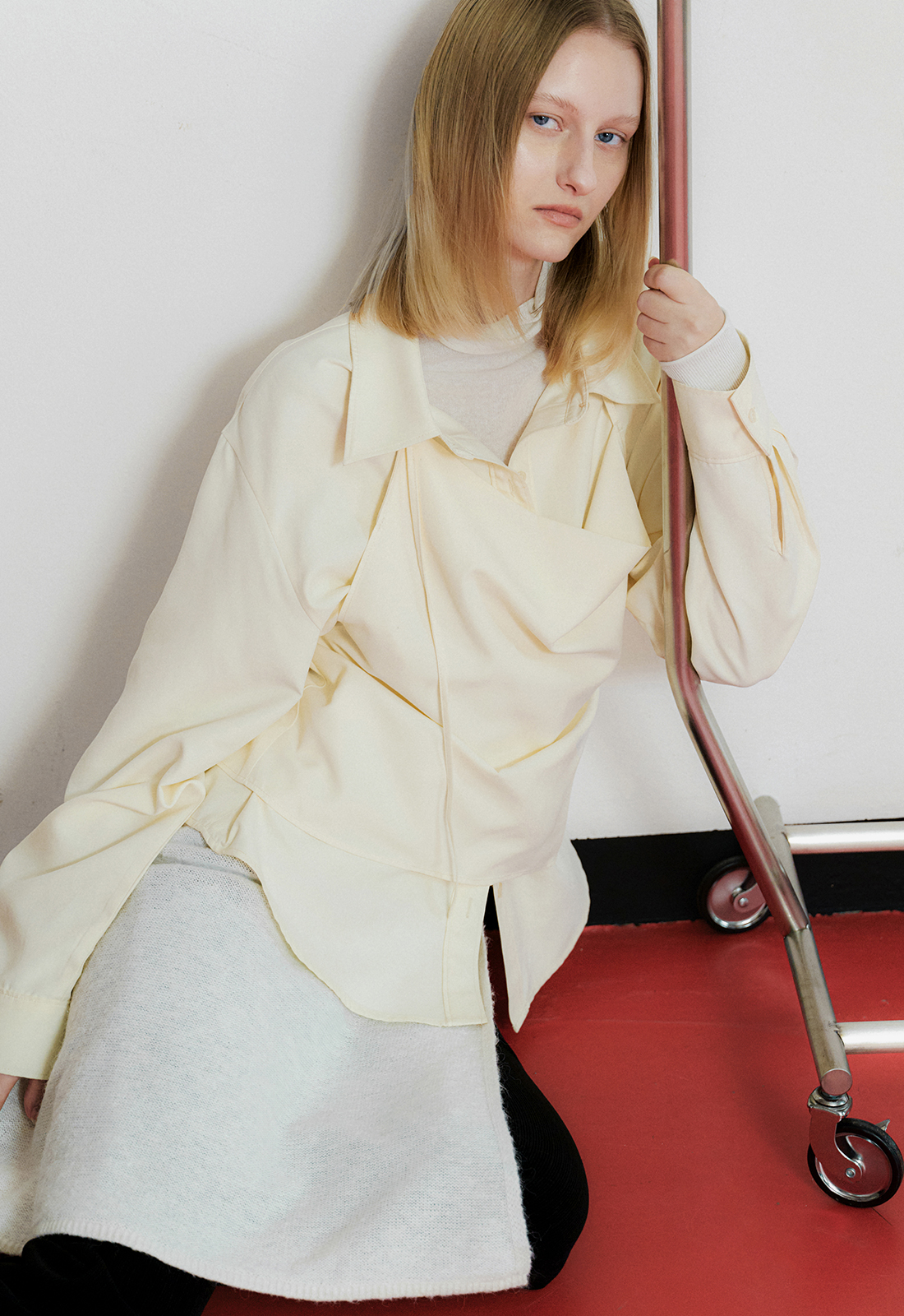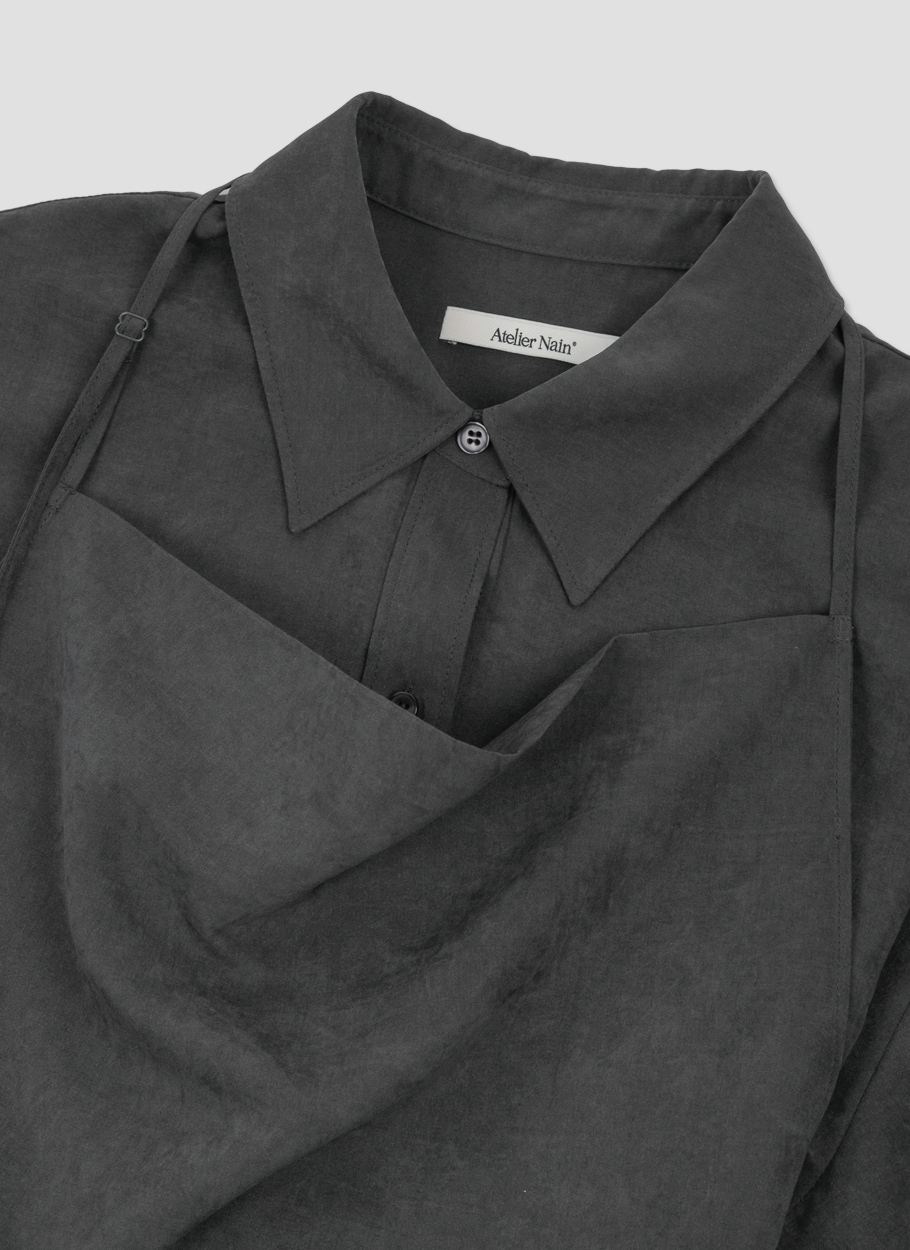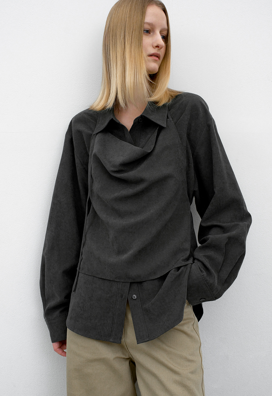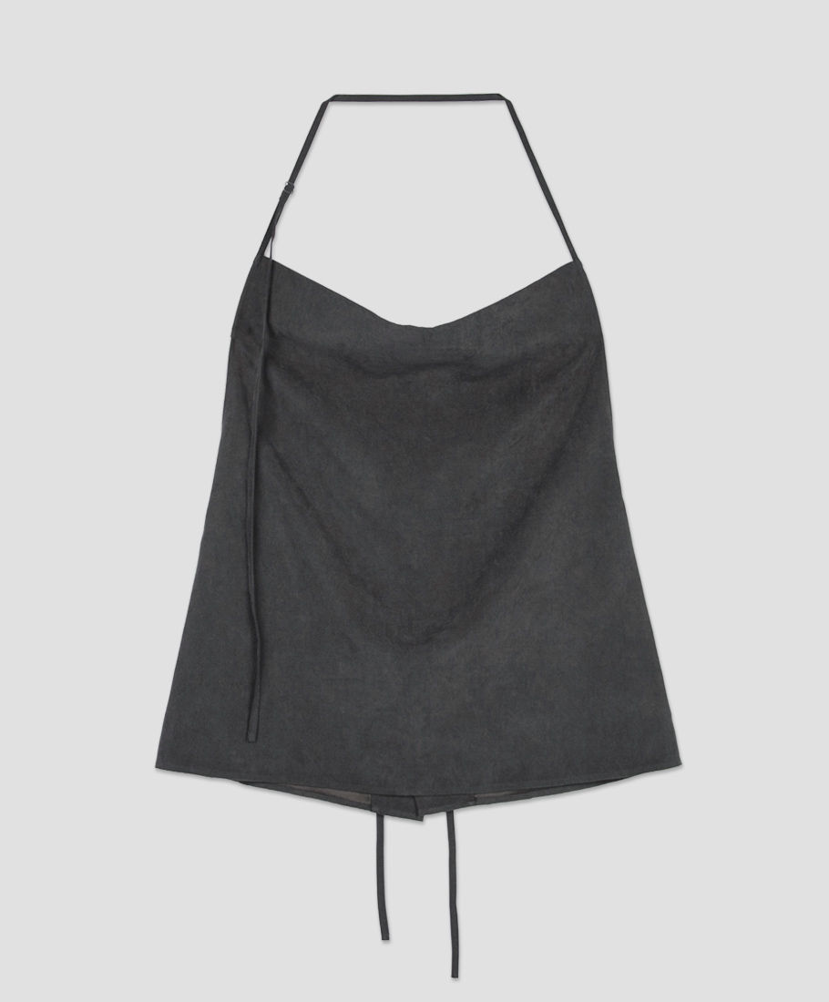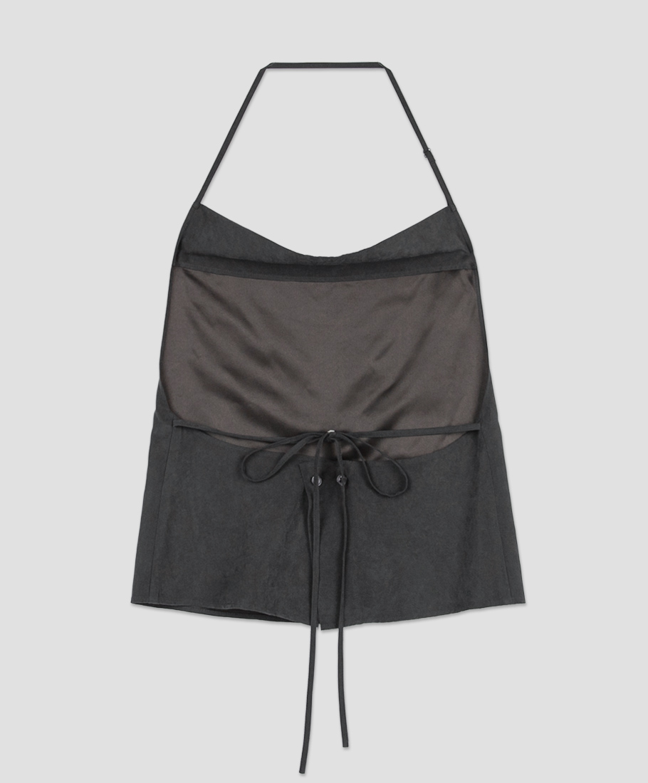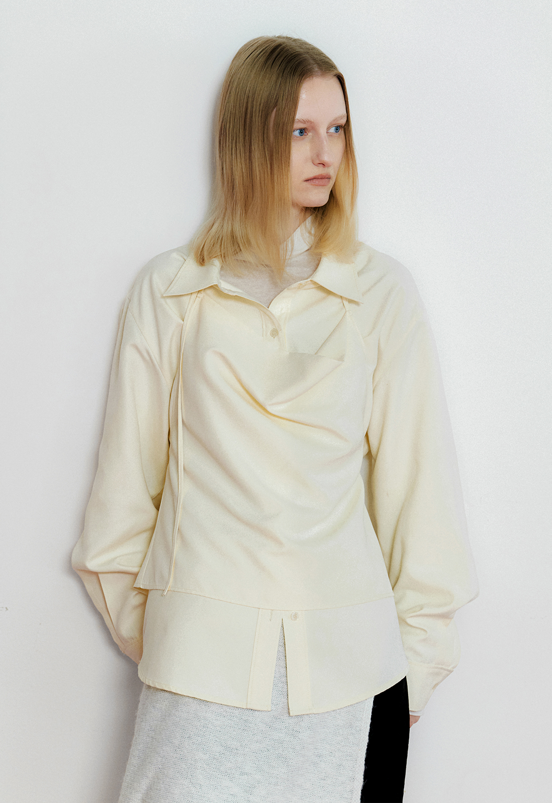 드레이프 실루엣의 홀터넥 슬리브리스와 루즈한 셔츠가 조화를 이루어