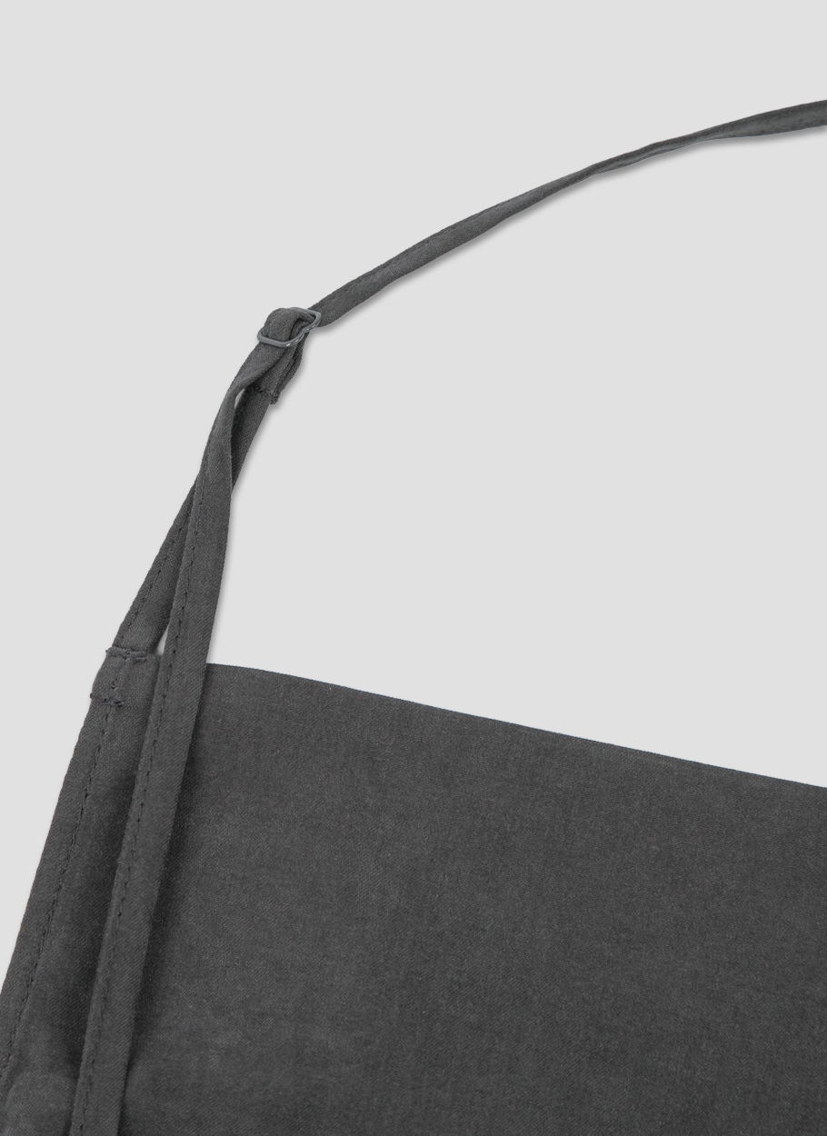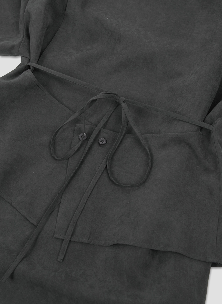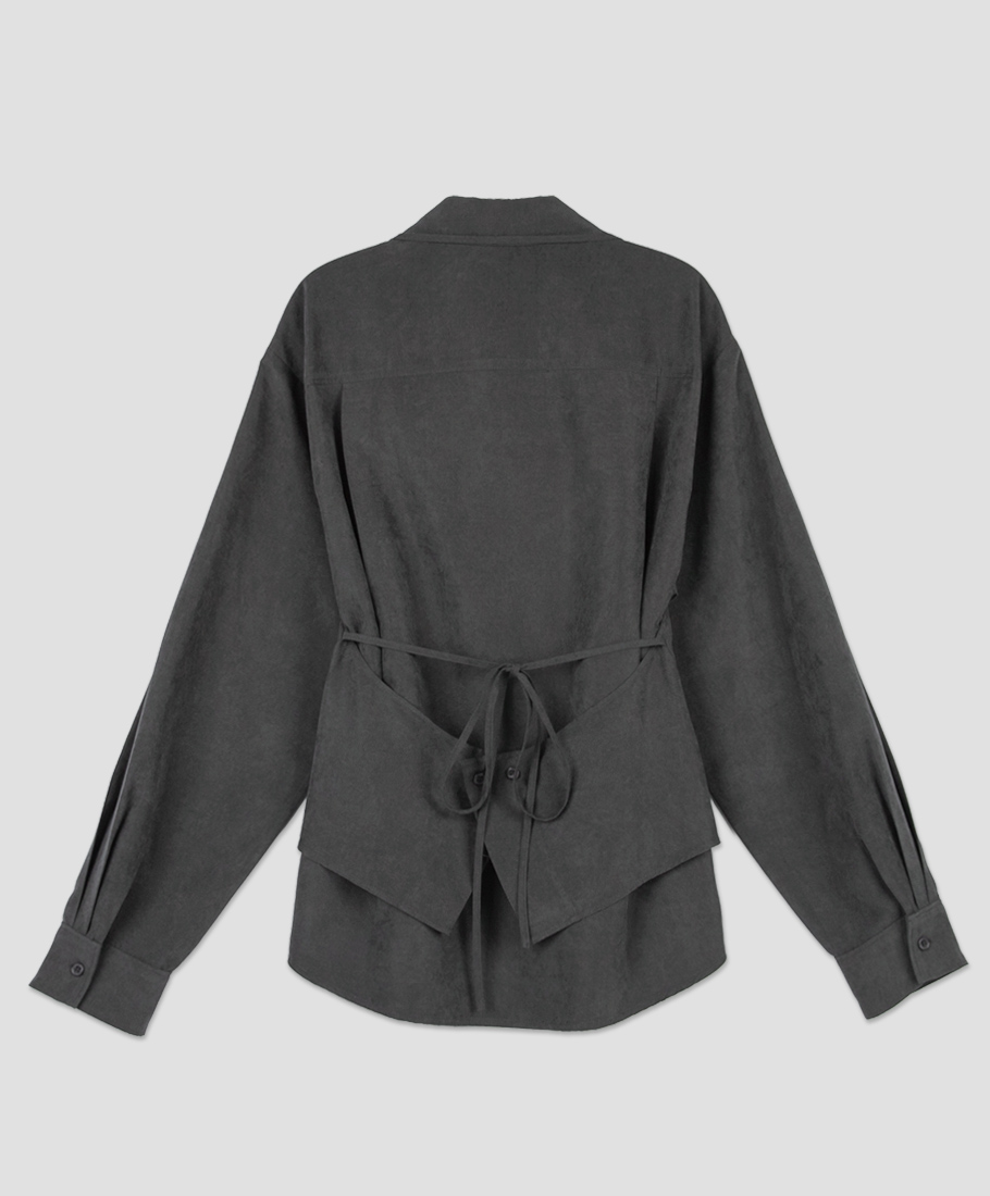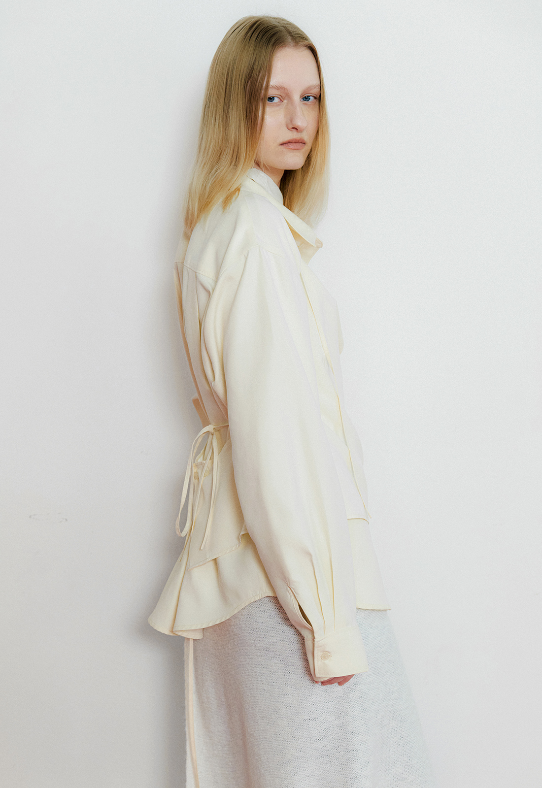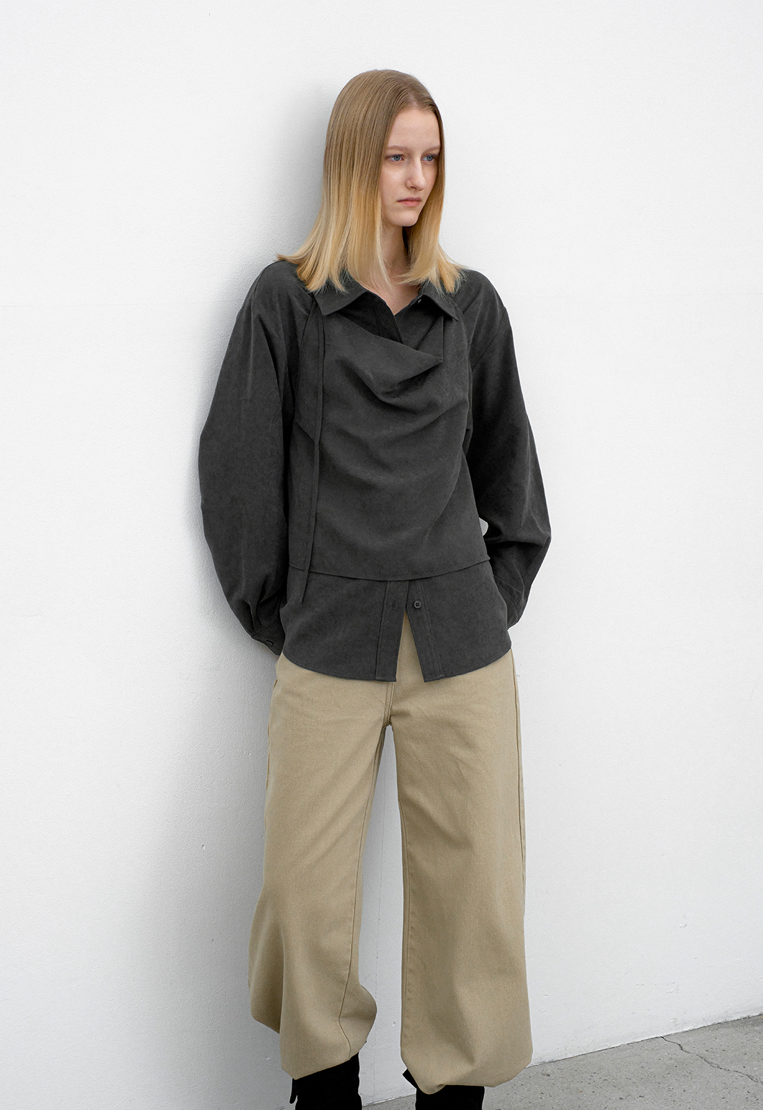 드레이프 실루엣의 홀터넥 슬리브리스와 루즈한 셔츠가 조화를 이루어
