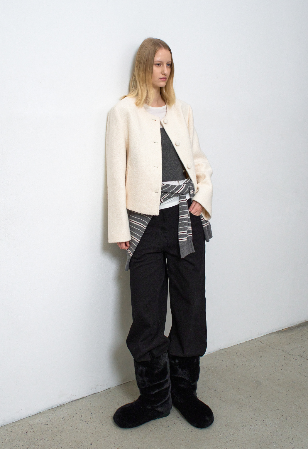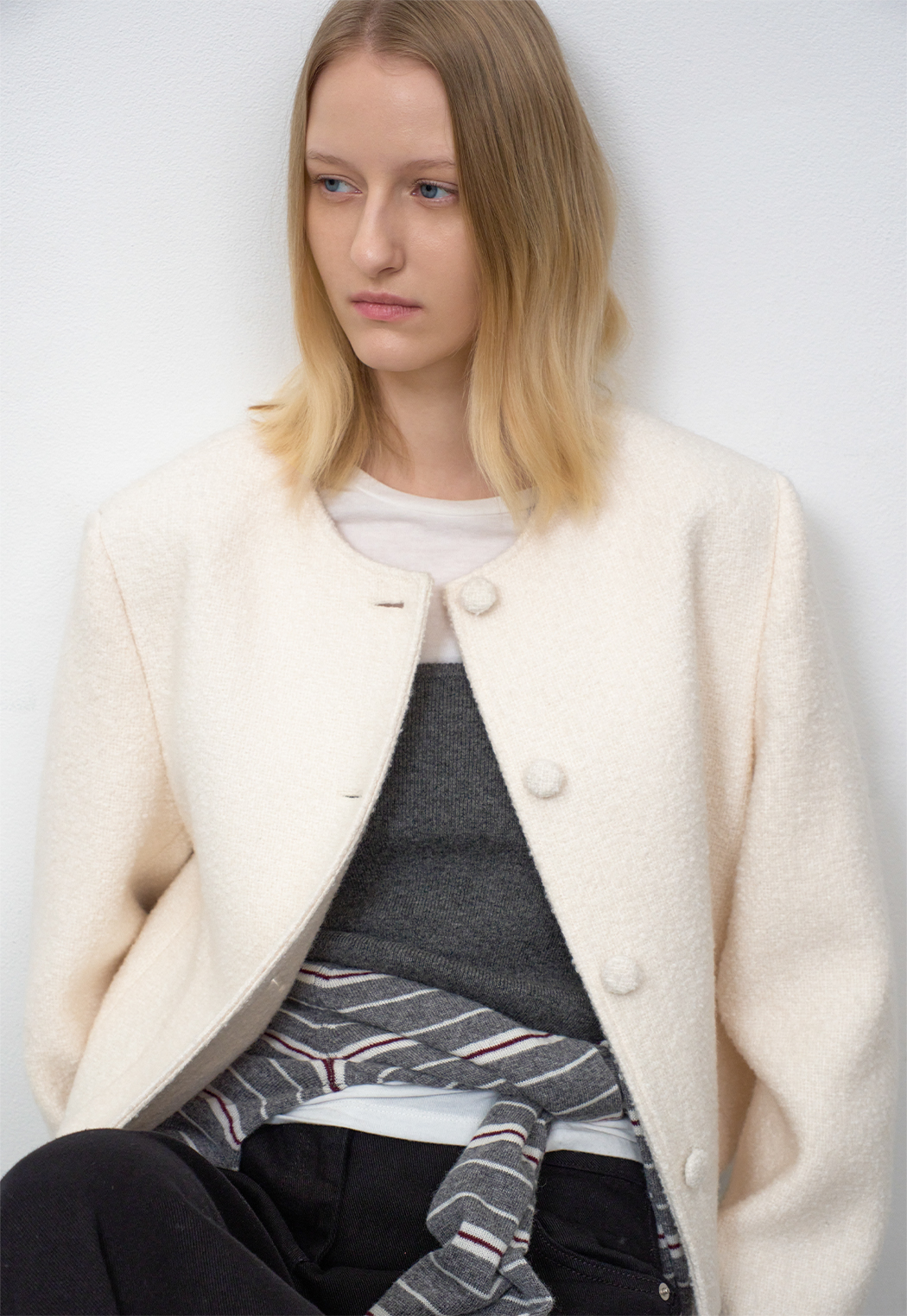 아틀리에 나인의 고급스러운 무드를 느낄 수 있는 트위드 자켓입니다.