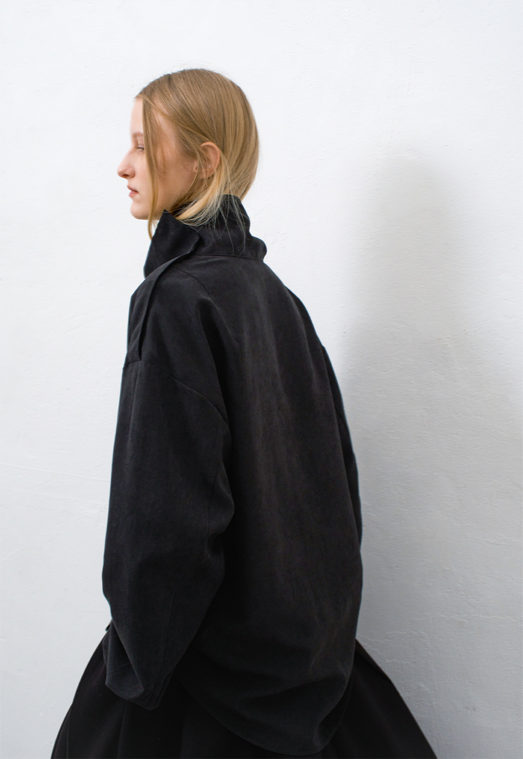 어깨 여밈으로 다 잠그면 카훌이 지는 하이넥으로 연출,