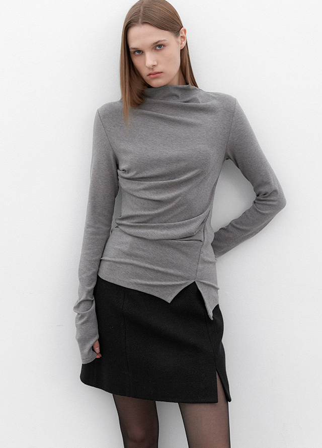 소프트한 터치감의 소재감으로 드레이핑된 디자인이 특징인 반 하이넥 티셔츠입니다.