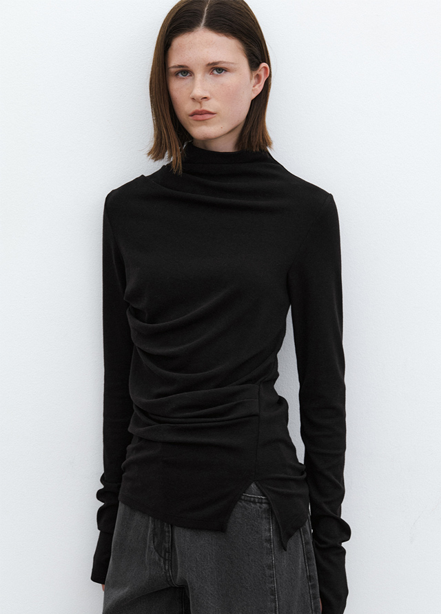 소프트한 터치감의 소재감으로 드레이핑된 디자인이 특징인 반 하이넥 티셔츠입니다.