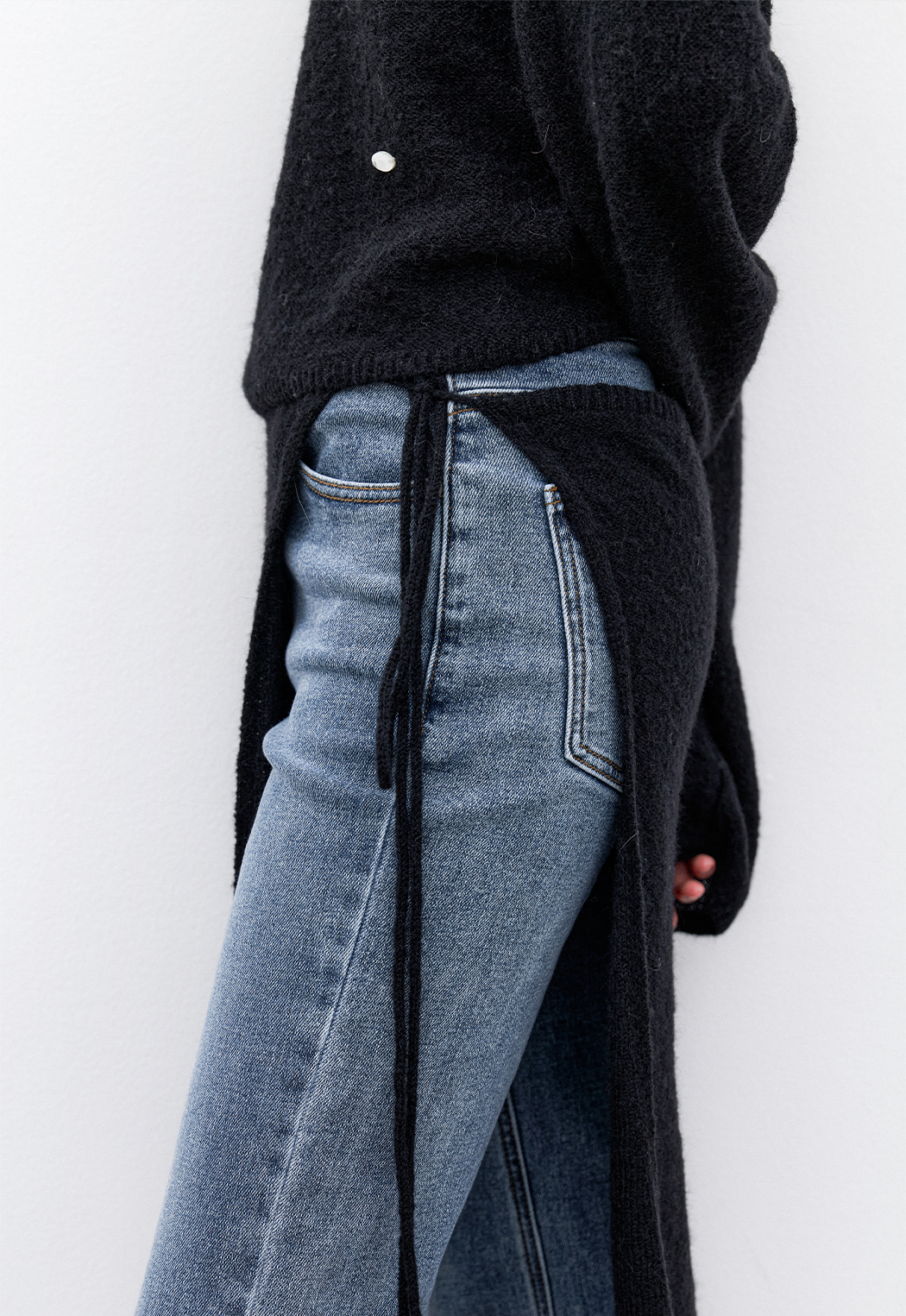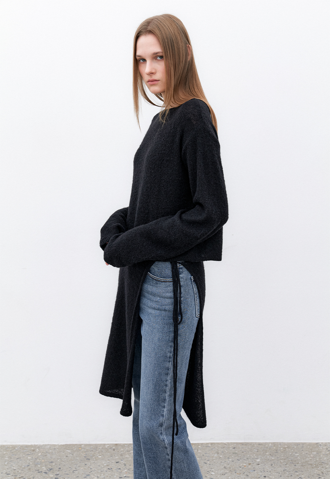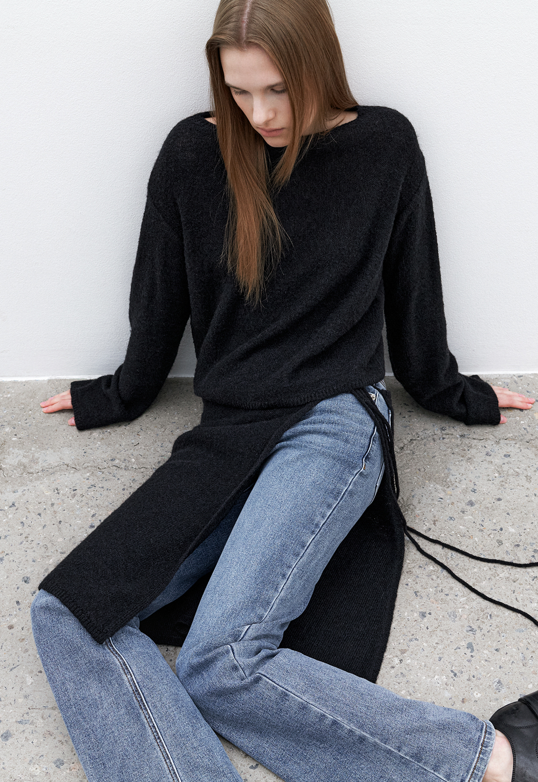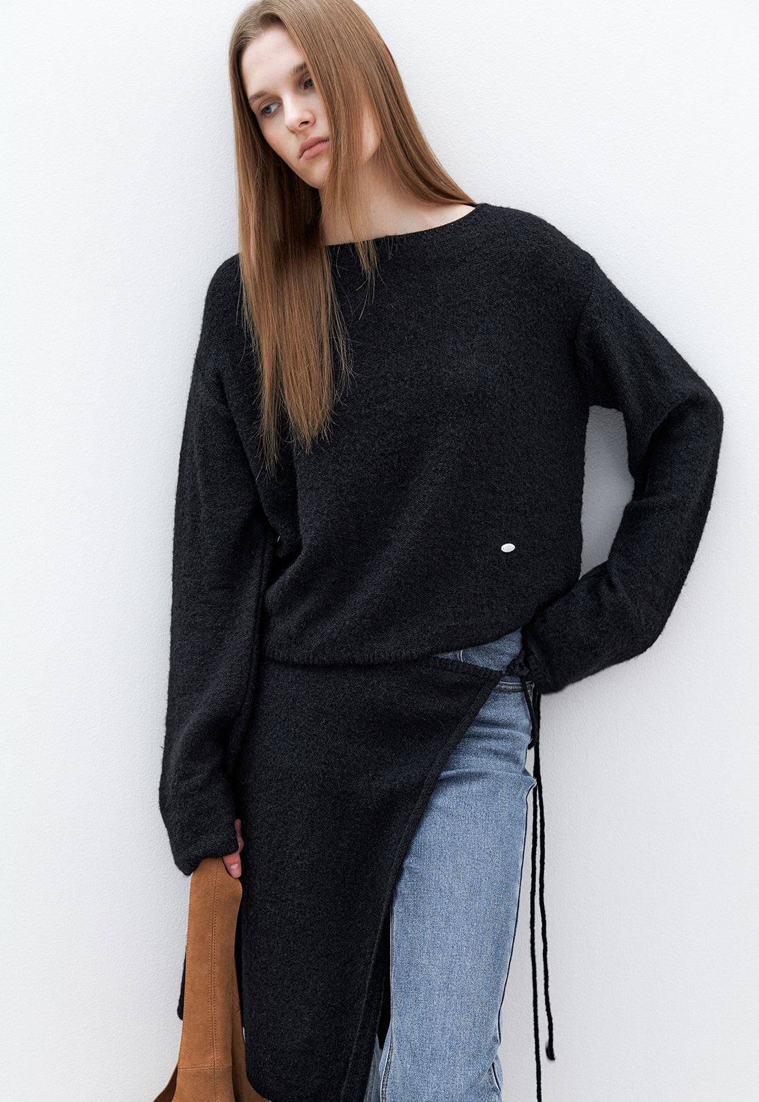 보트넥으로 네크 포인트가 되는 짧은 기장의 풀오버와