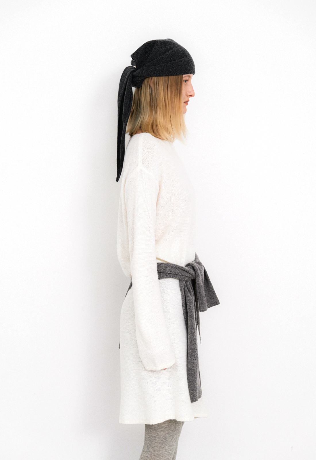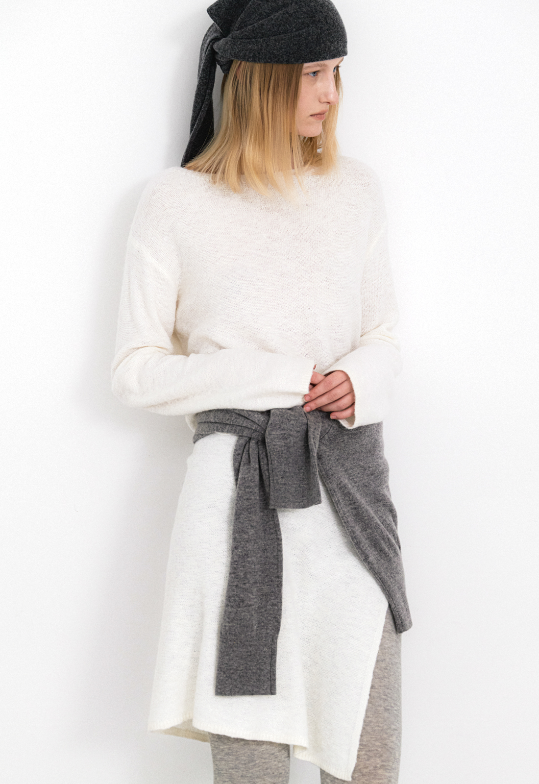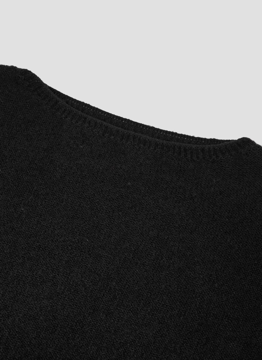 보트넥으로 네크 포인트가 되는 짧은 기장의 풀오버와