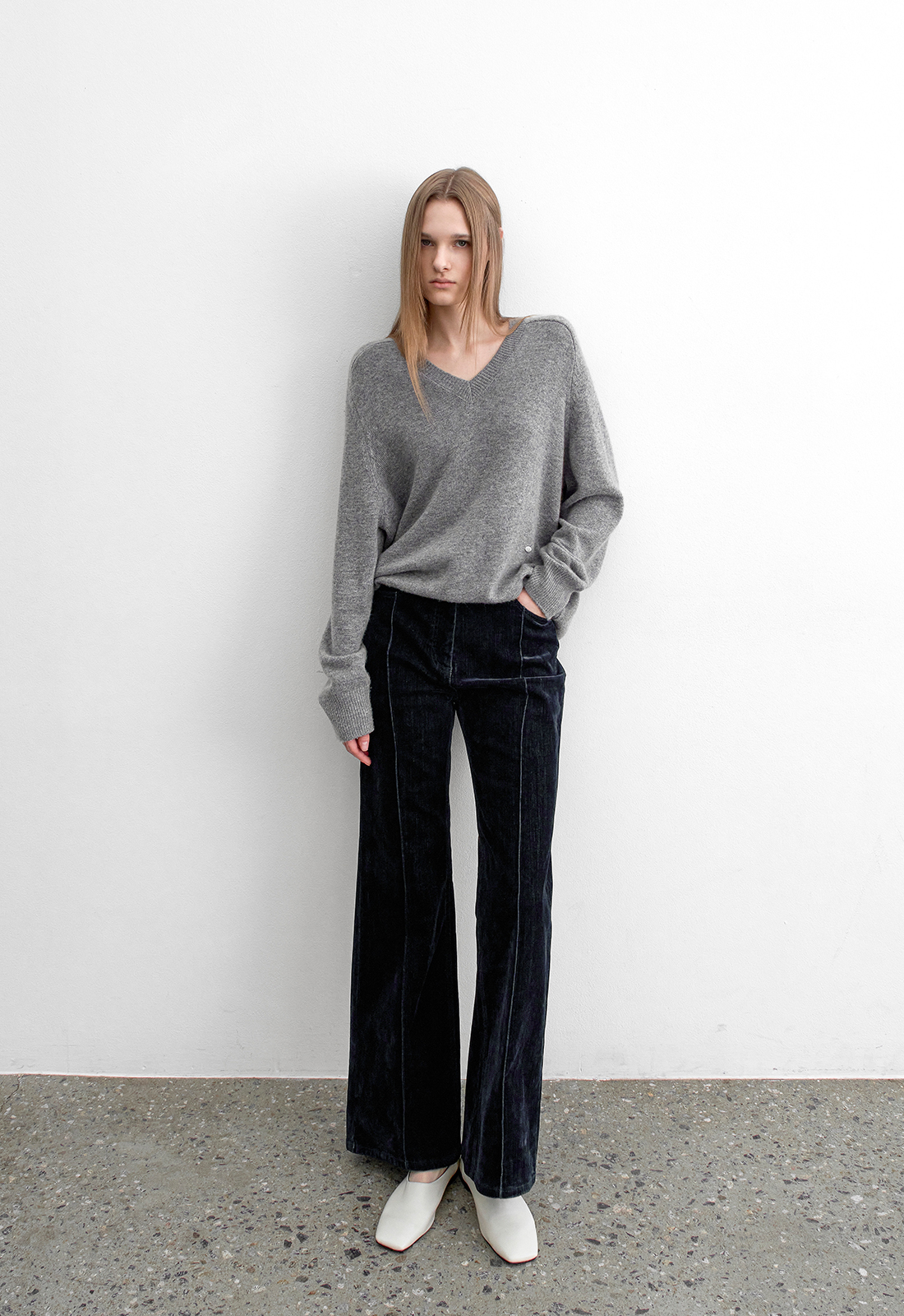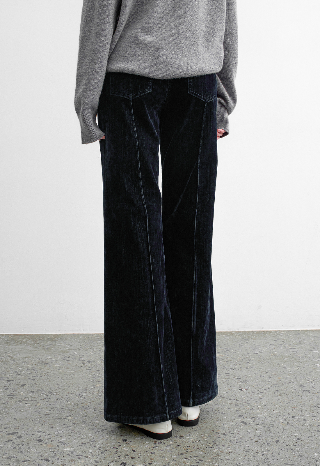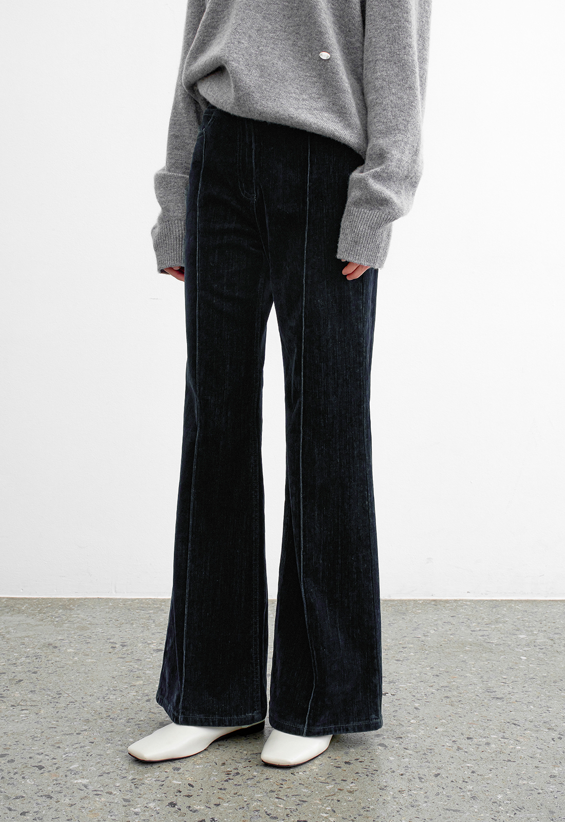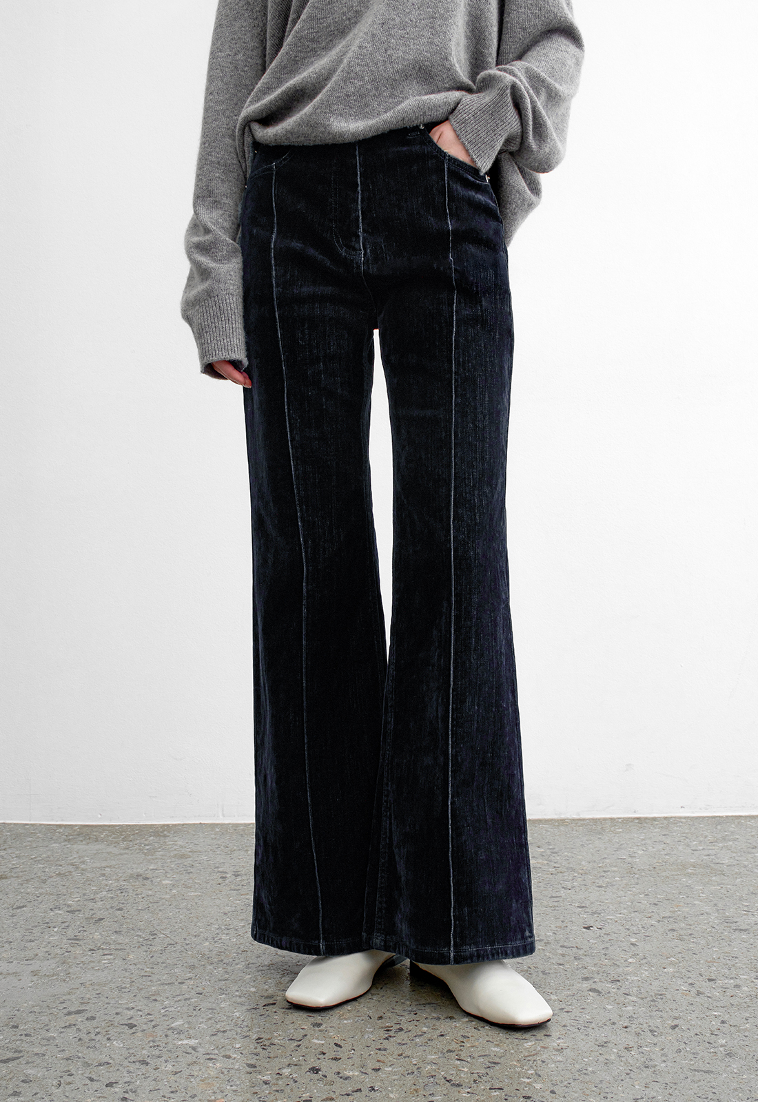 벨벳데님으로 만들어진 부츠컷 데님 팬츠입니다.