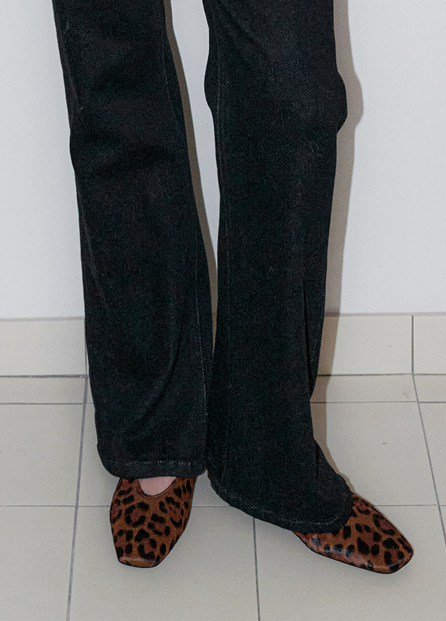 애니멀 프린트의 카프 헤어로 제작된 플랫 슈즈입니다.
