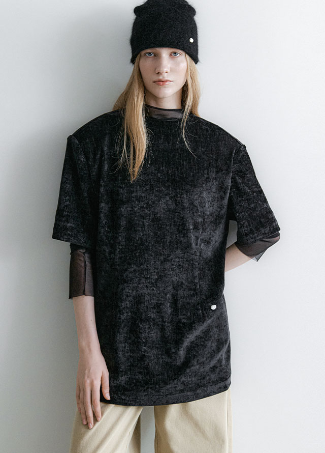 고급스러운 벨벳 소재가 돋보이는 하프슬리브 블라우스입니다.