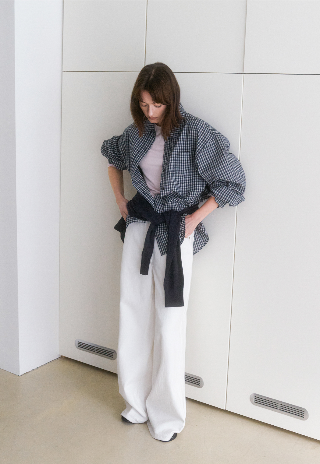 자연스럽게 드롭된 어깨 라인과 여유 있는 실루엣으로