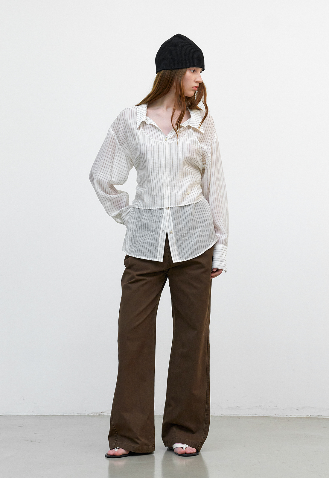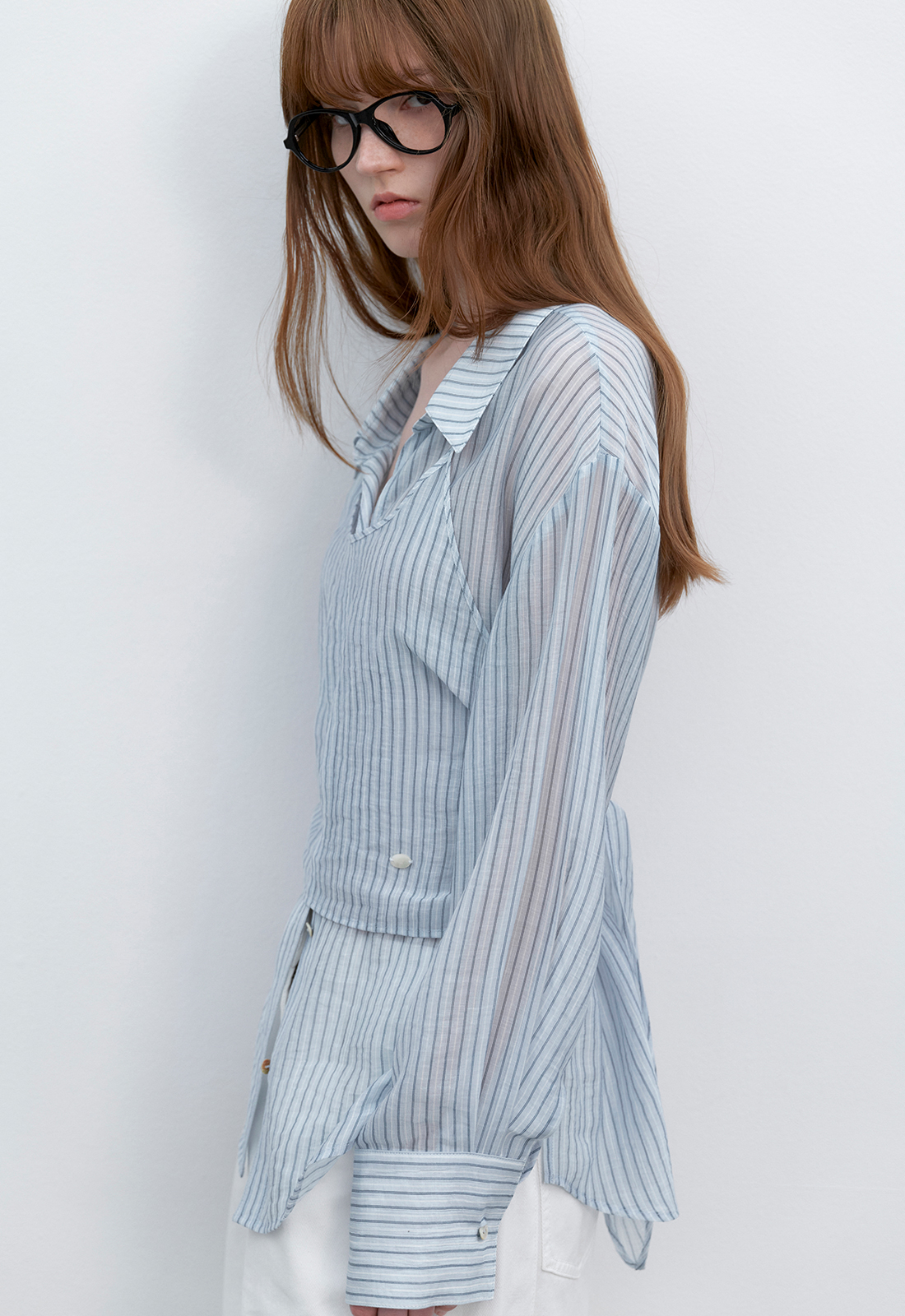 뷔스티에 탑과 레이어드해 한층 여성스러운 무드를 완성한 블라우스입니다.