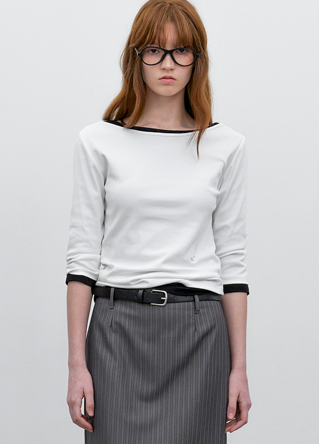 슬림한 실루엣의 보트넥 티셔츠로, 단독 착용이나 이너 레이어링 모두 가능한 아이템입니다.