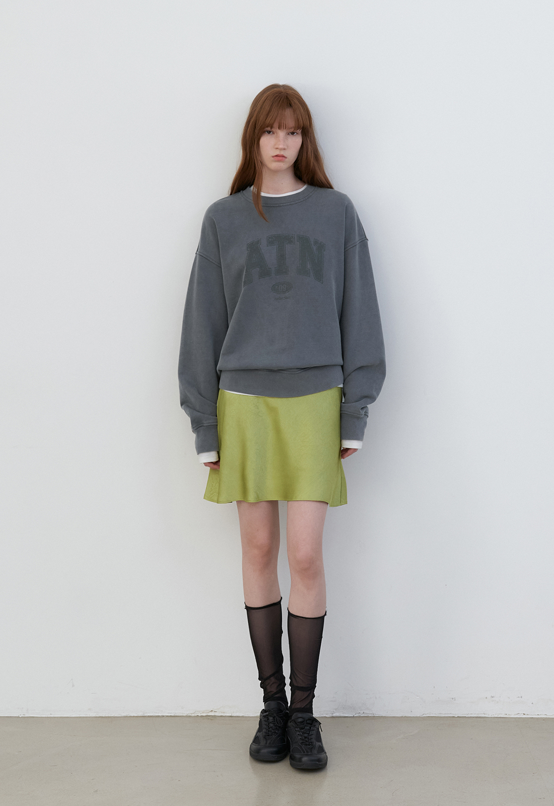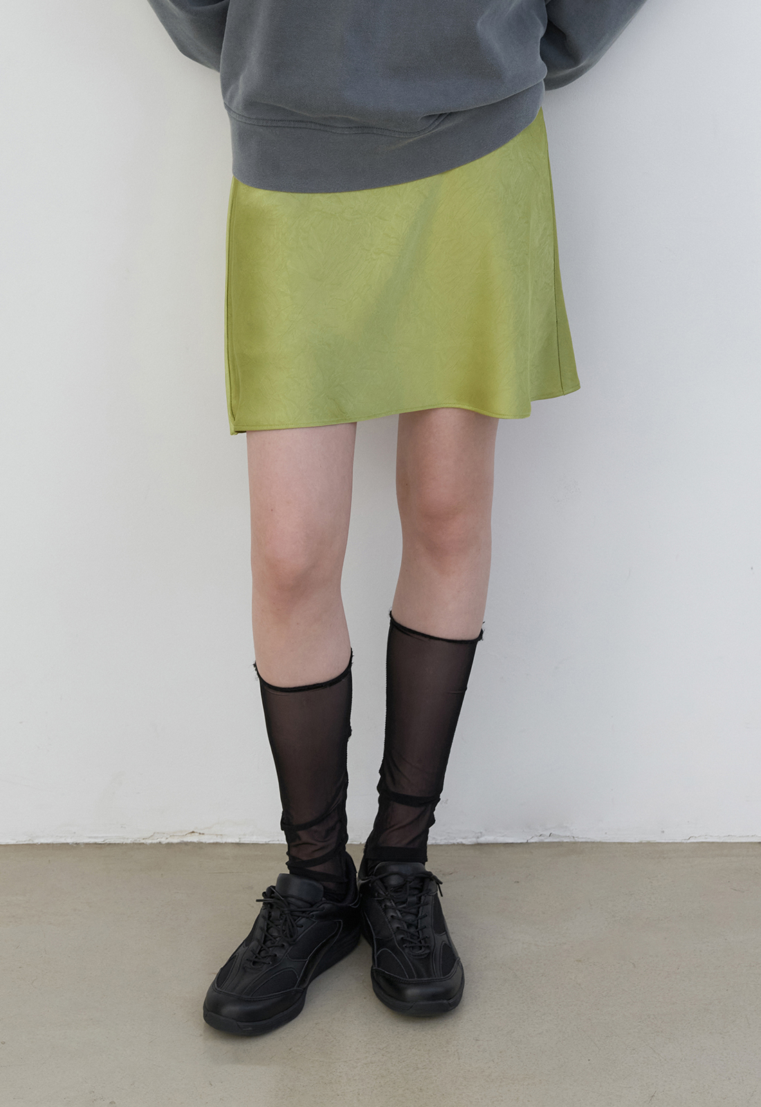 세틴 소재의 페미닌한 무드를 살린 미니스커트입니다.
