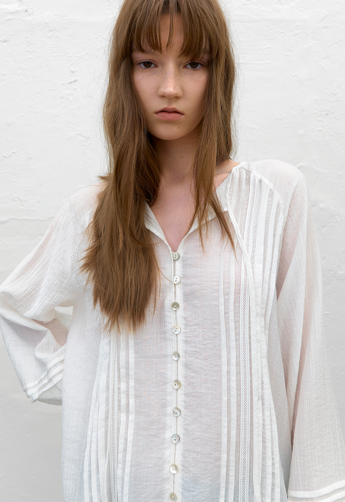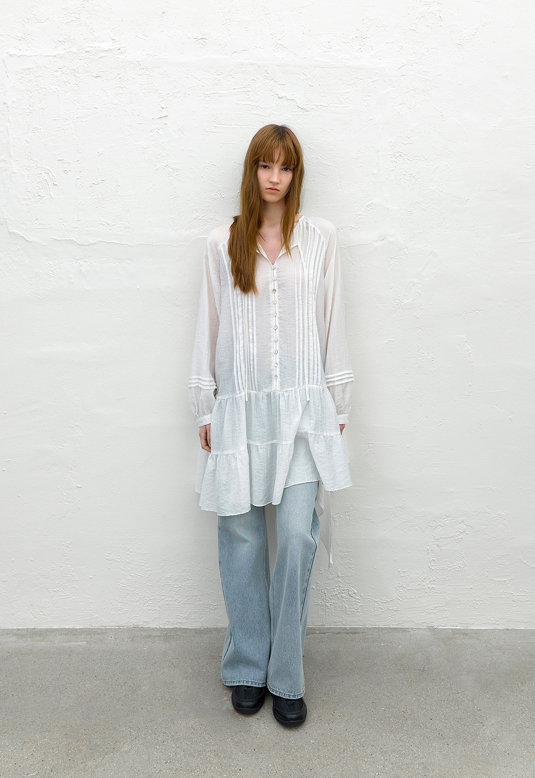 쉬어한 소재감으로 팬츠와 레이어드해 착용하기 좋은 아이템입니다.