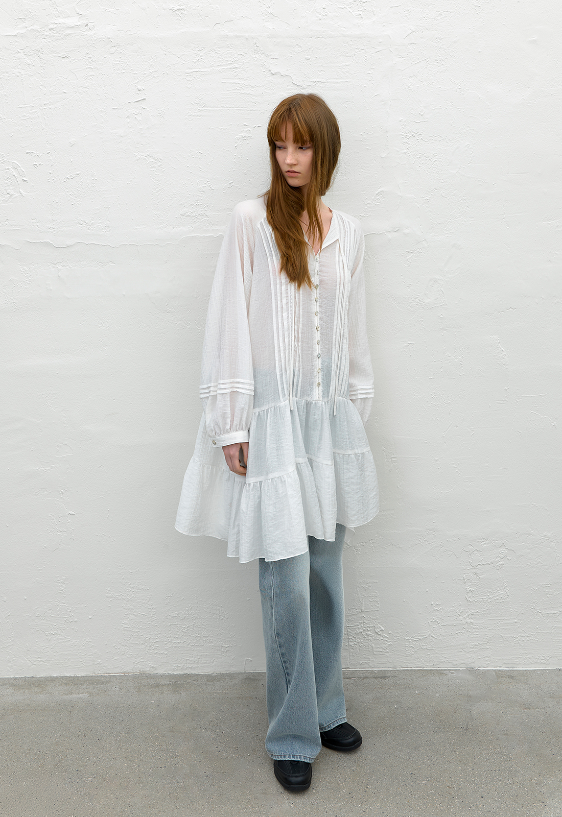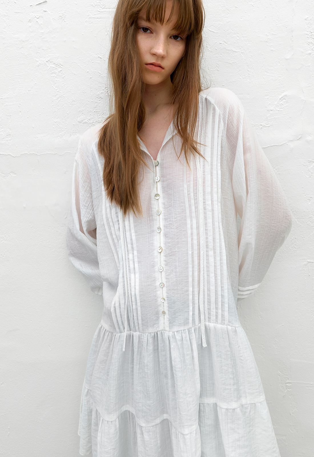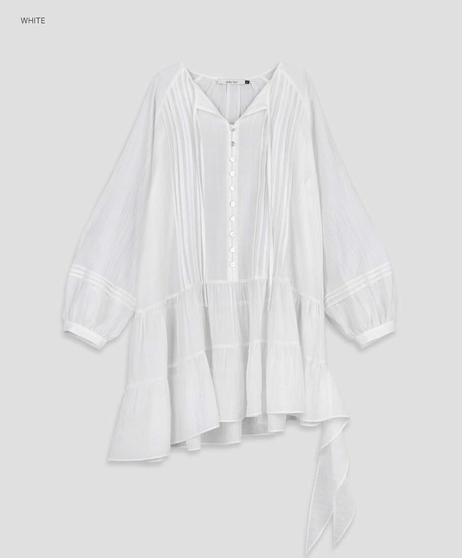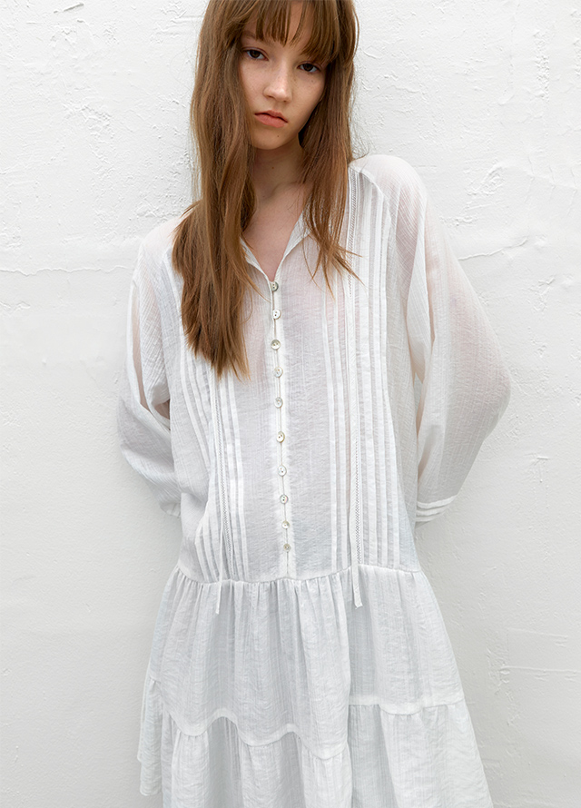 핀턱과 레이스 테이프 디테일로 포인트를 준 미니 원피스입니다.