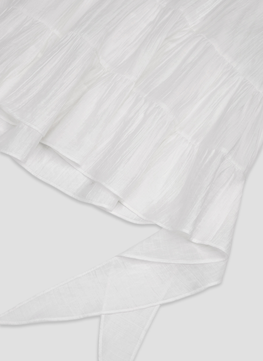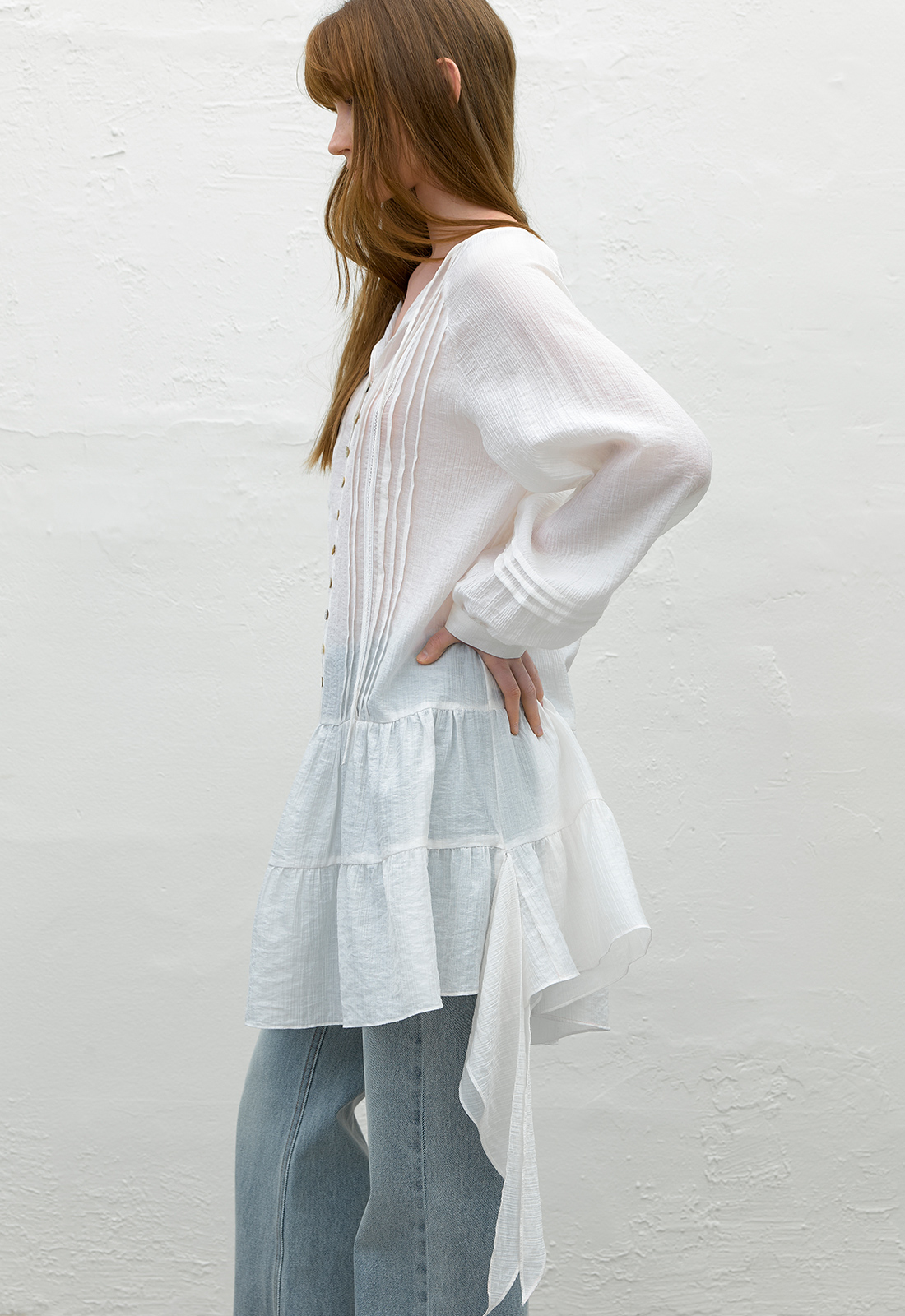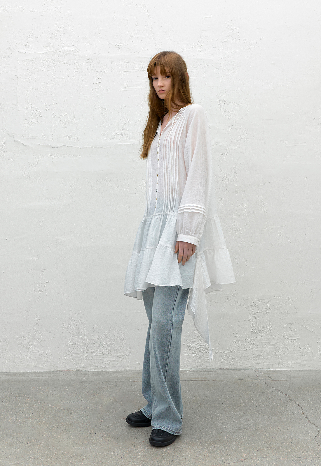 언발란스한 기장과 드레이프 지며 떨어지는 밑단이 어우러져