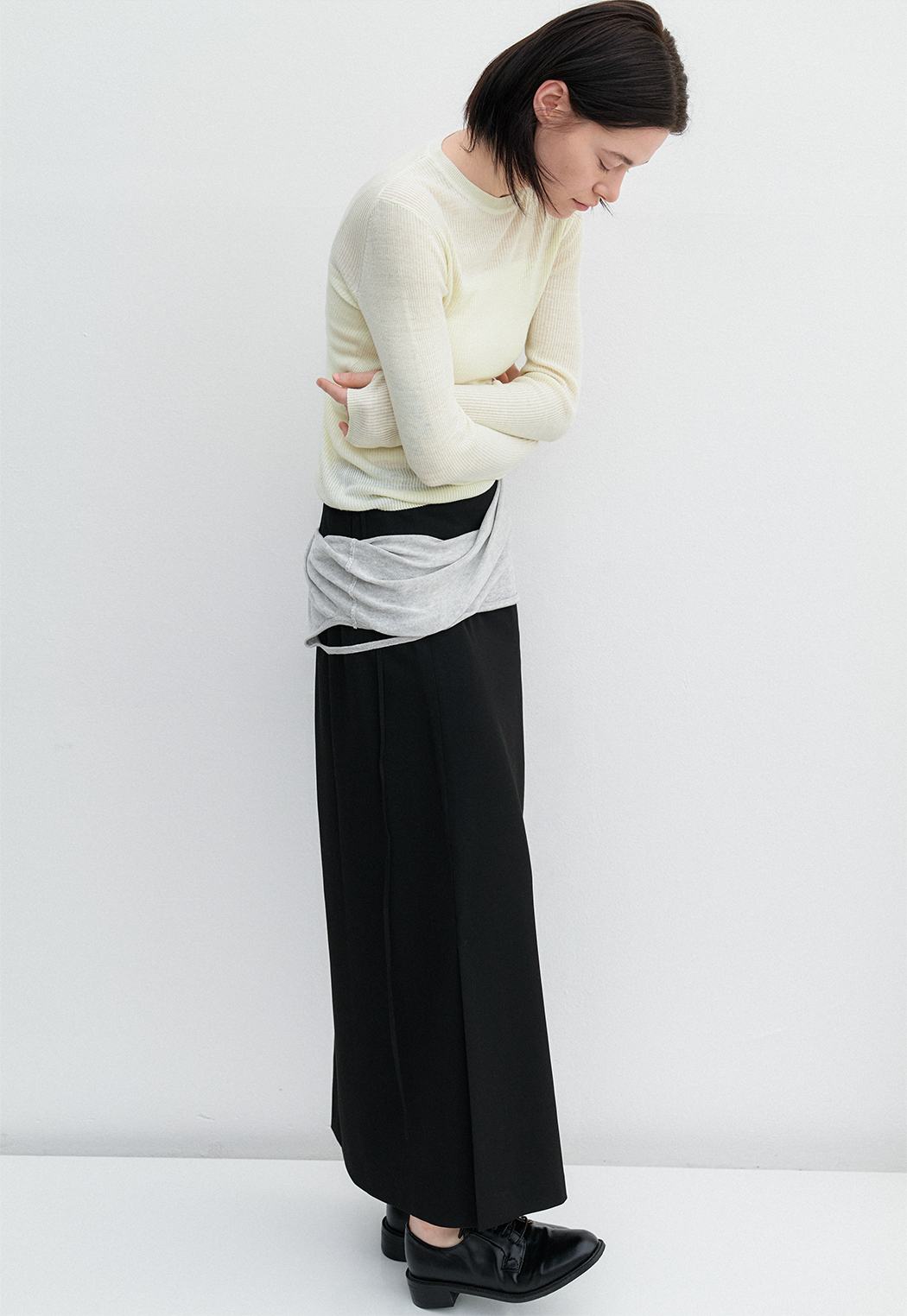 부드럽고 얇은 소재로 흐르듯 떨어지는 슬림한 실루엣이 특징입니다.