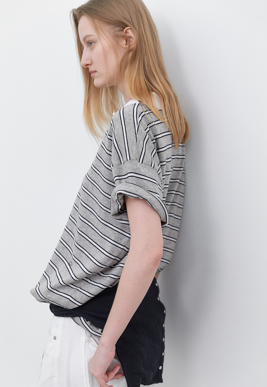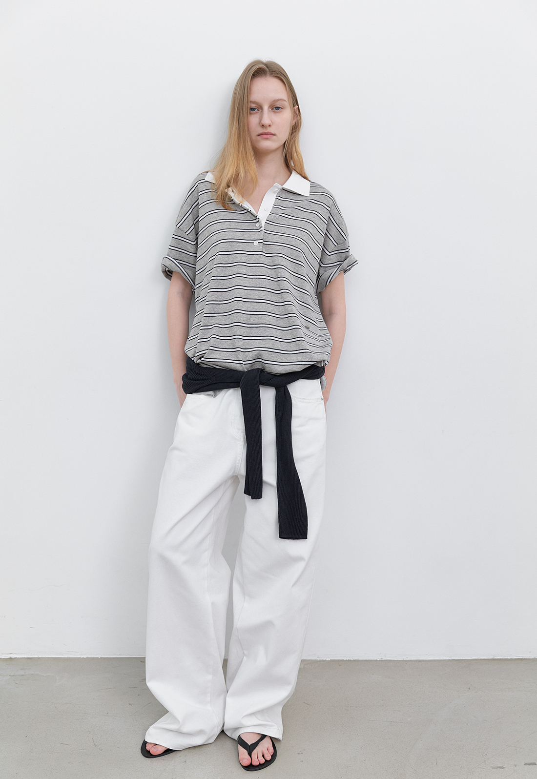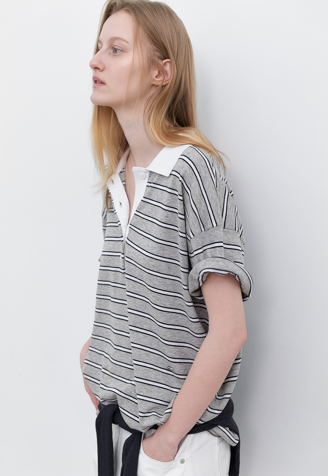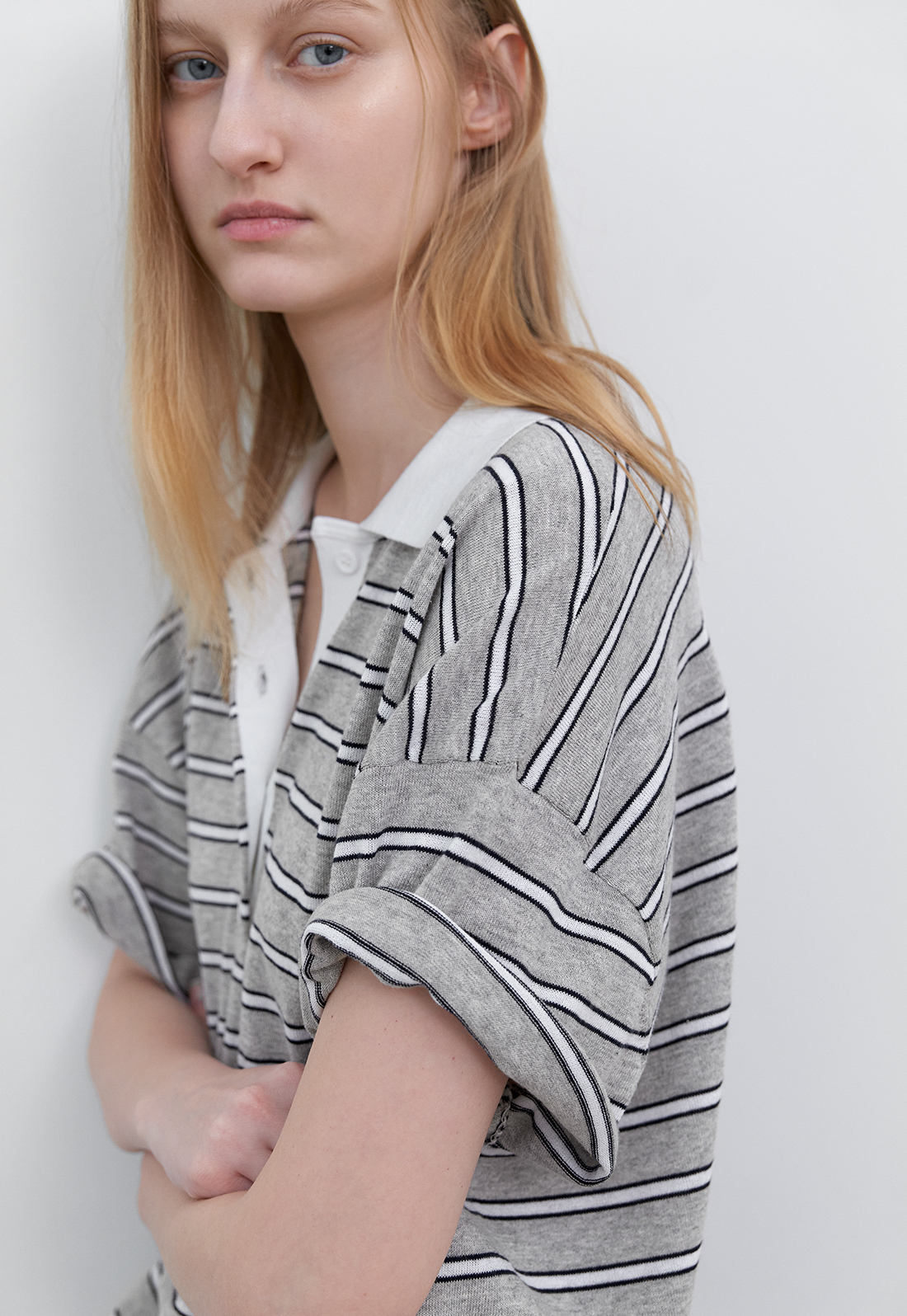 (T-7242)LOOSE FIT HALF SLEEVE STRIPED POLO KNIT