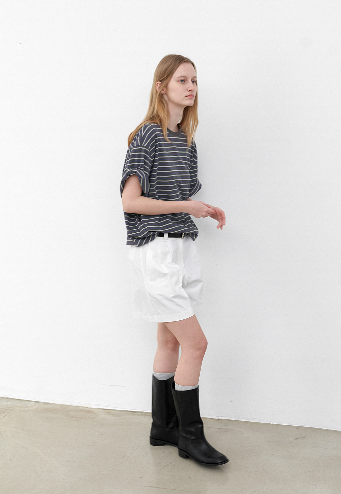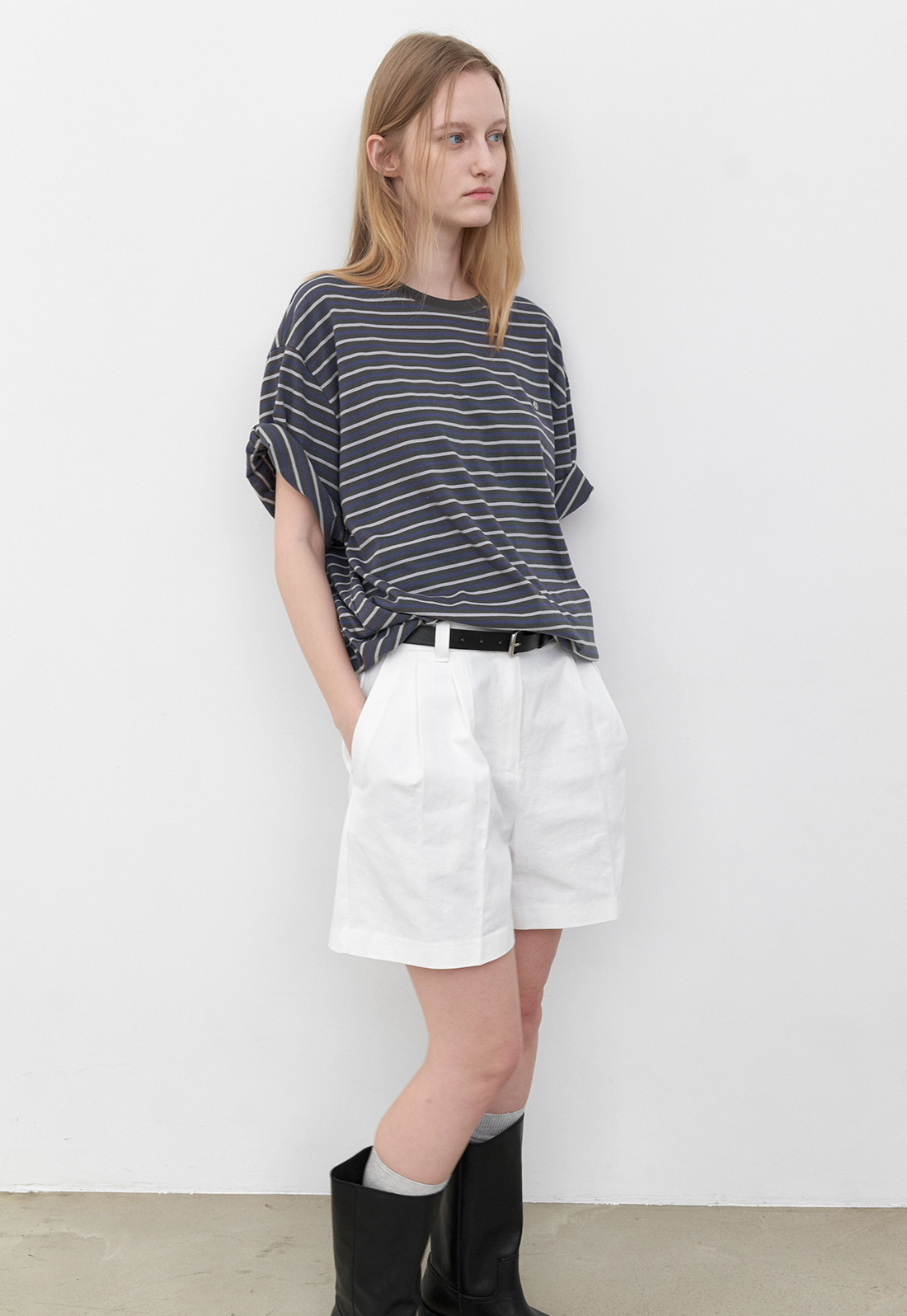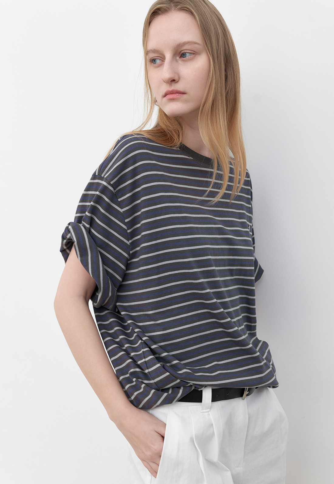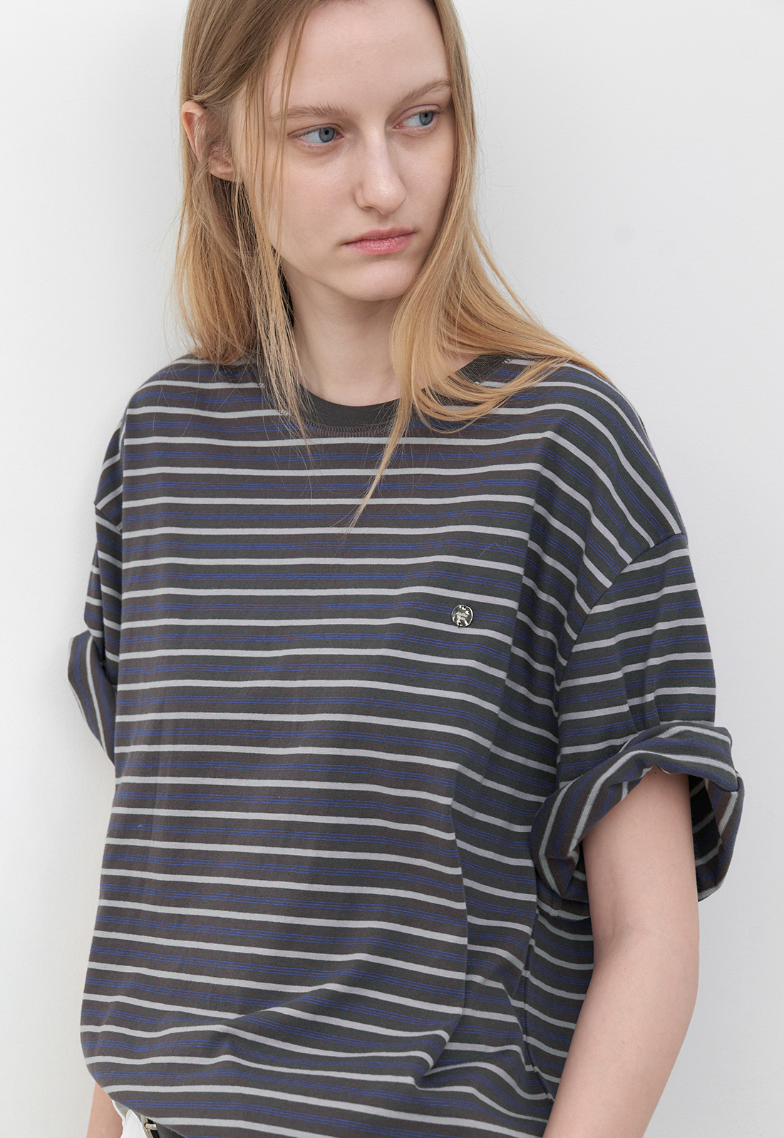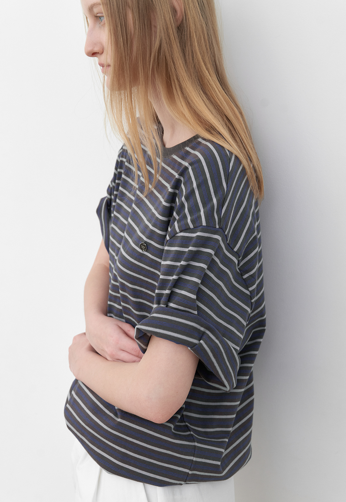 핀 스트라이프와 배색 리브 디테일이 돋보이는 박시핏 티셔츠입니다.