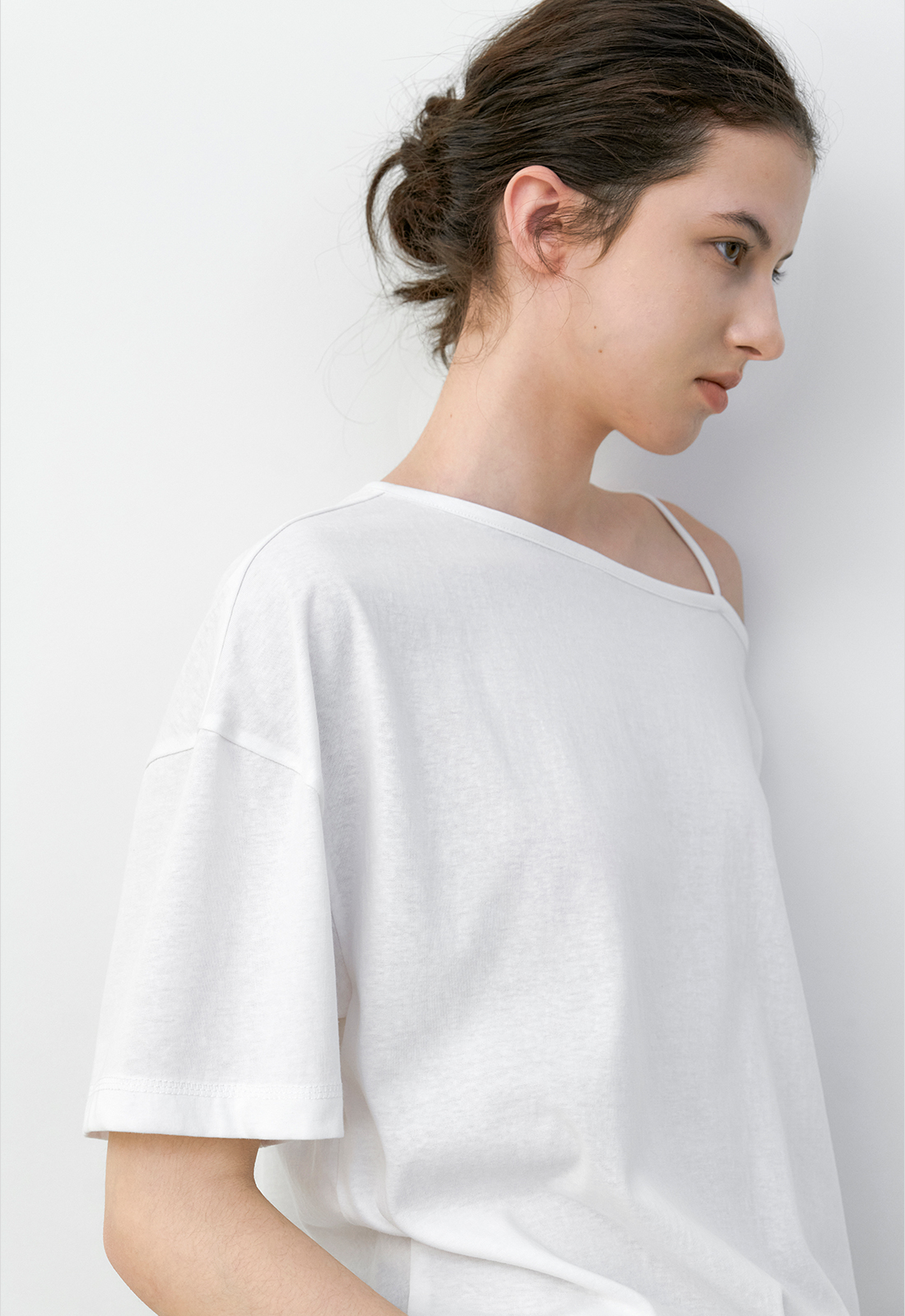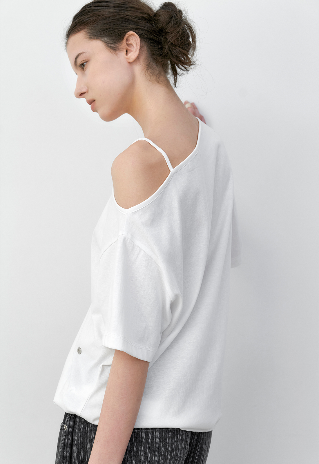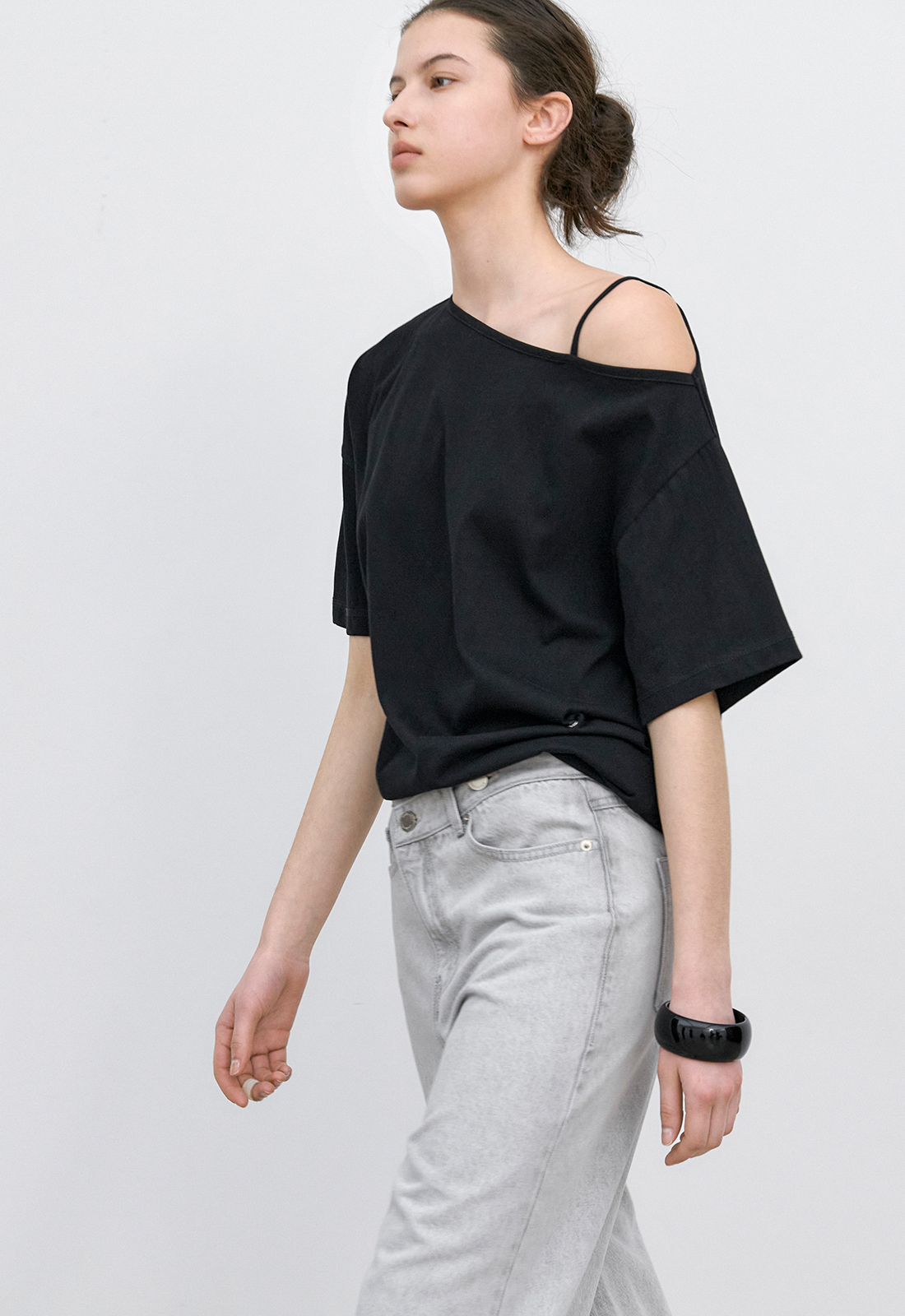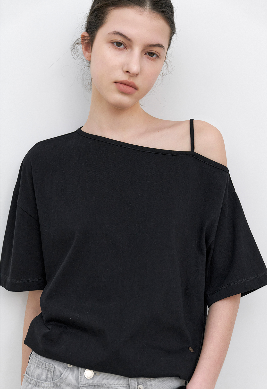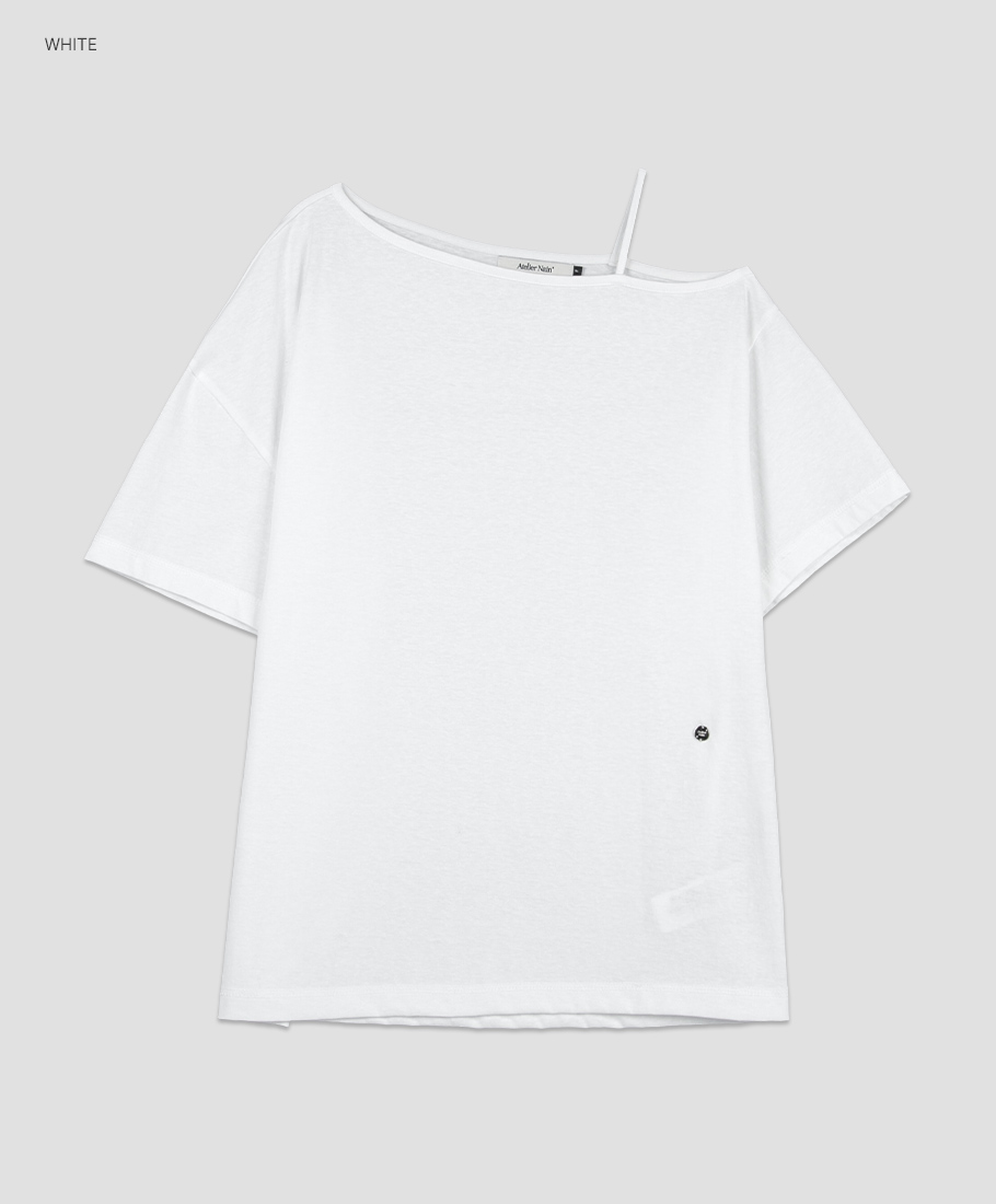 한쪽 숄더가 자연스럽게 드러나는 원 오프숄더 티셔츠입니다.